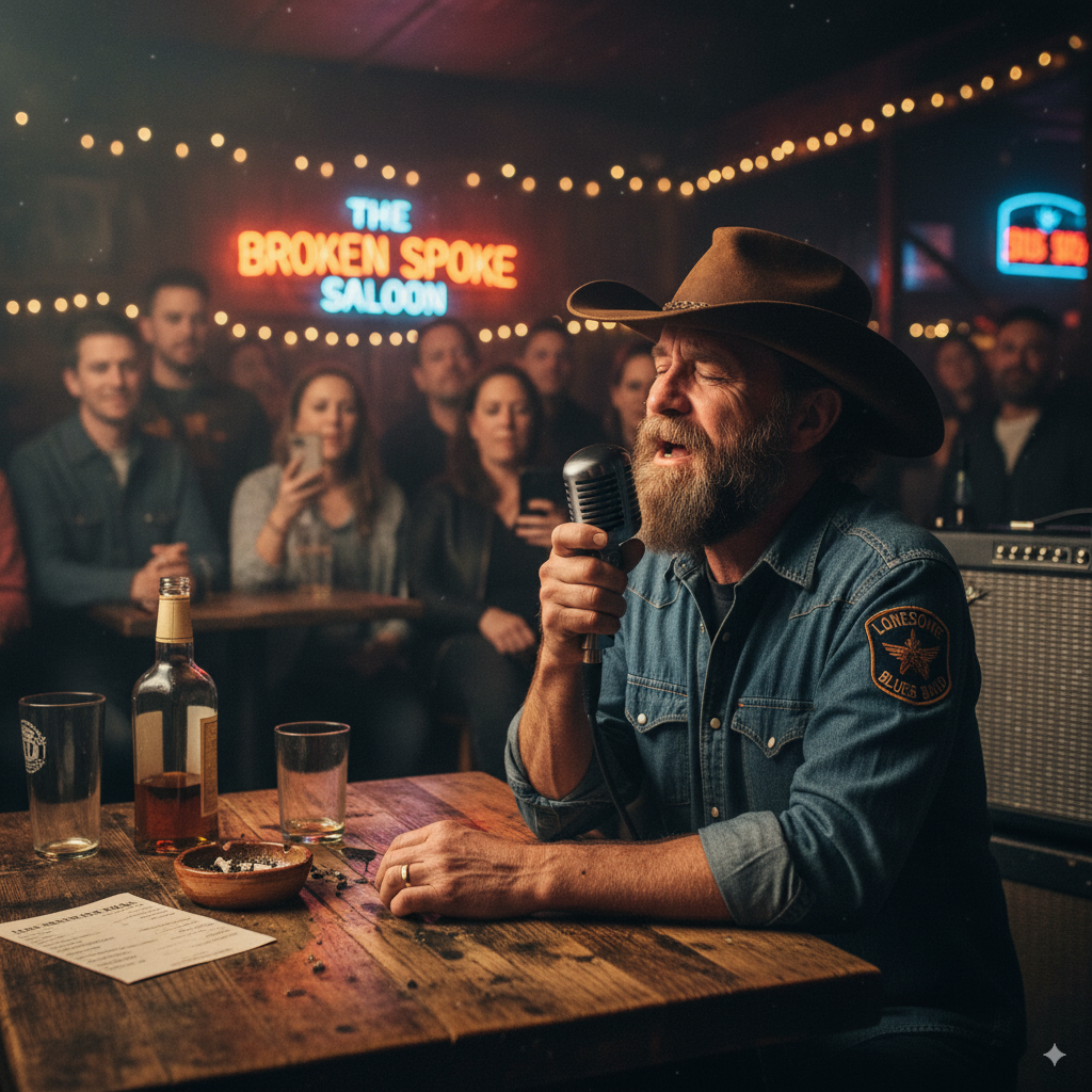 A raw outlaw country rock anthem with driving electric guitars, twangy riffs, and a steady, rebellious rhythm, Blend southern rock grit with classic country storytelling, Deep baritone vocals with a weathered edge, singing about freedom, whiskey, and the open road, Add harmonica flourishes and slide guitar for texture, Drumbeat is punchy and straightforward, evoking barroom energy, Atmosphere should feel dusty, rebellious, and cinematic — like a desert highway at dusk, neon bar signs flickering, and a restless spirit chasing trouble, live concert feeling