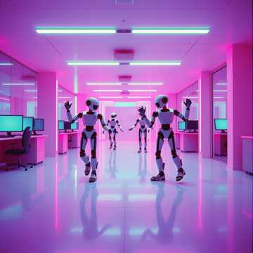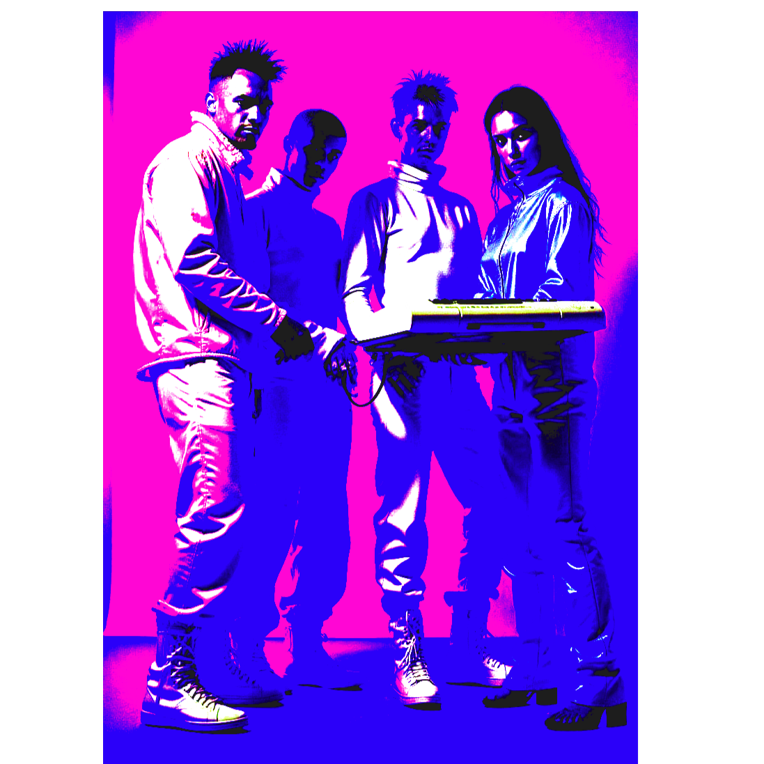 Hardcore late 70’s / early 80’s new wave, eerie slower tempo, underground pulsing synths, angular guitars, synth drum solos, avant-garde gritty male singer, avant-garde gritty female singer, call-and-response delivery, Dark, robotic, and surreal in the style of Devo meets Gary Numan with B-52’s weirdness, Plastic, artificial atmosphere, underground robotic beat