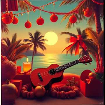 Djent pop, electronic, emotional, happy, high-notes, atmospheric, metal guitar, female singer, catchy, shred, Hawaiian, Ukulele, Christmas
