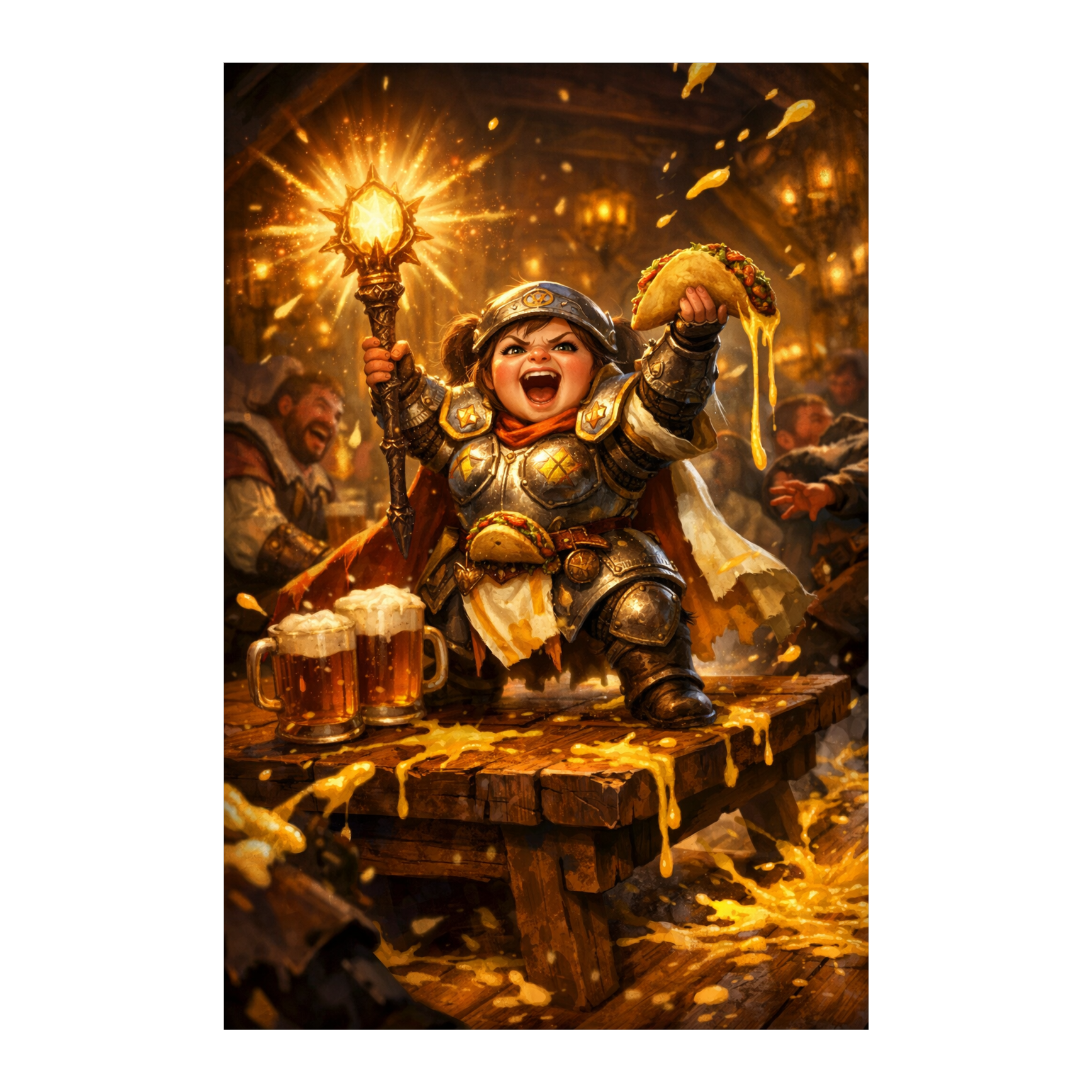 Upbeat tavern folk fused with pirate shanty rhythm and comedic musical energy, stomping percussion, fiddle, accordion, and acoustic guitar, playful female or mixed vocals with group chant choruses, lively and chaotic, like a D&D tavern singalong after too many drinks, humorous storytelling with energetic crowd moments