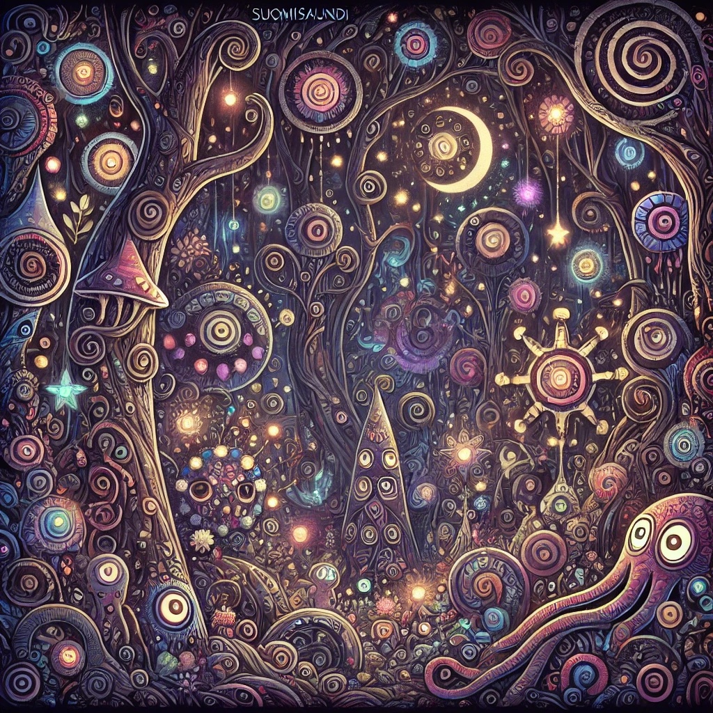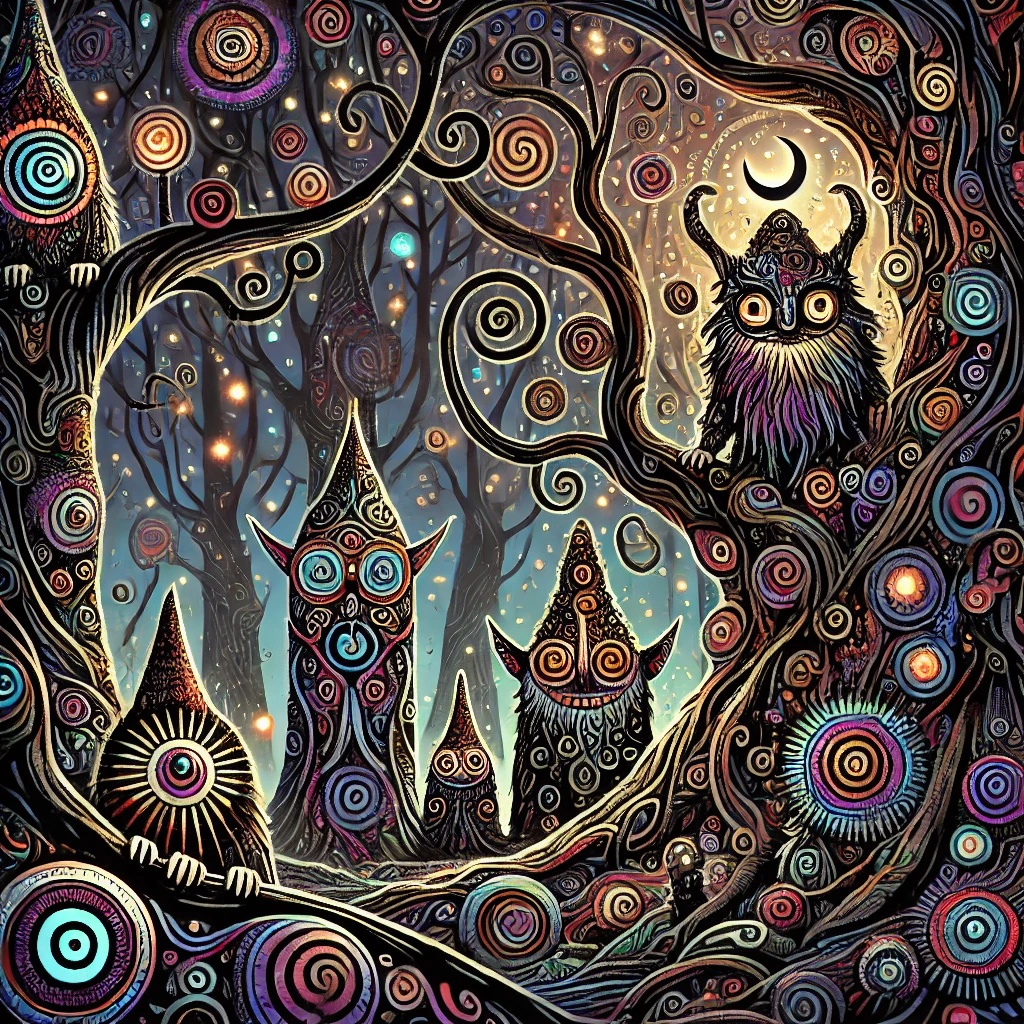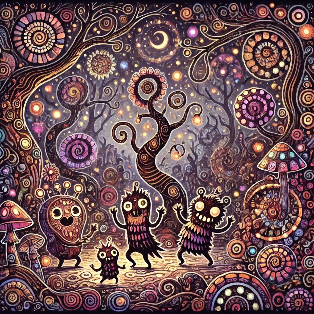 darkpsy, dark psytrance, quirky, unpredictable, forest, experimental, intricate, trippy, goatrance, playful, psychedelic