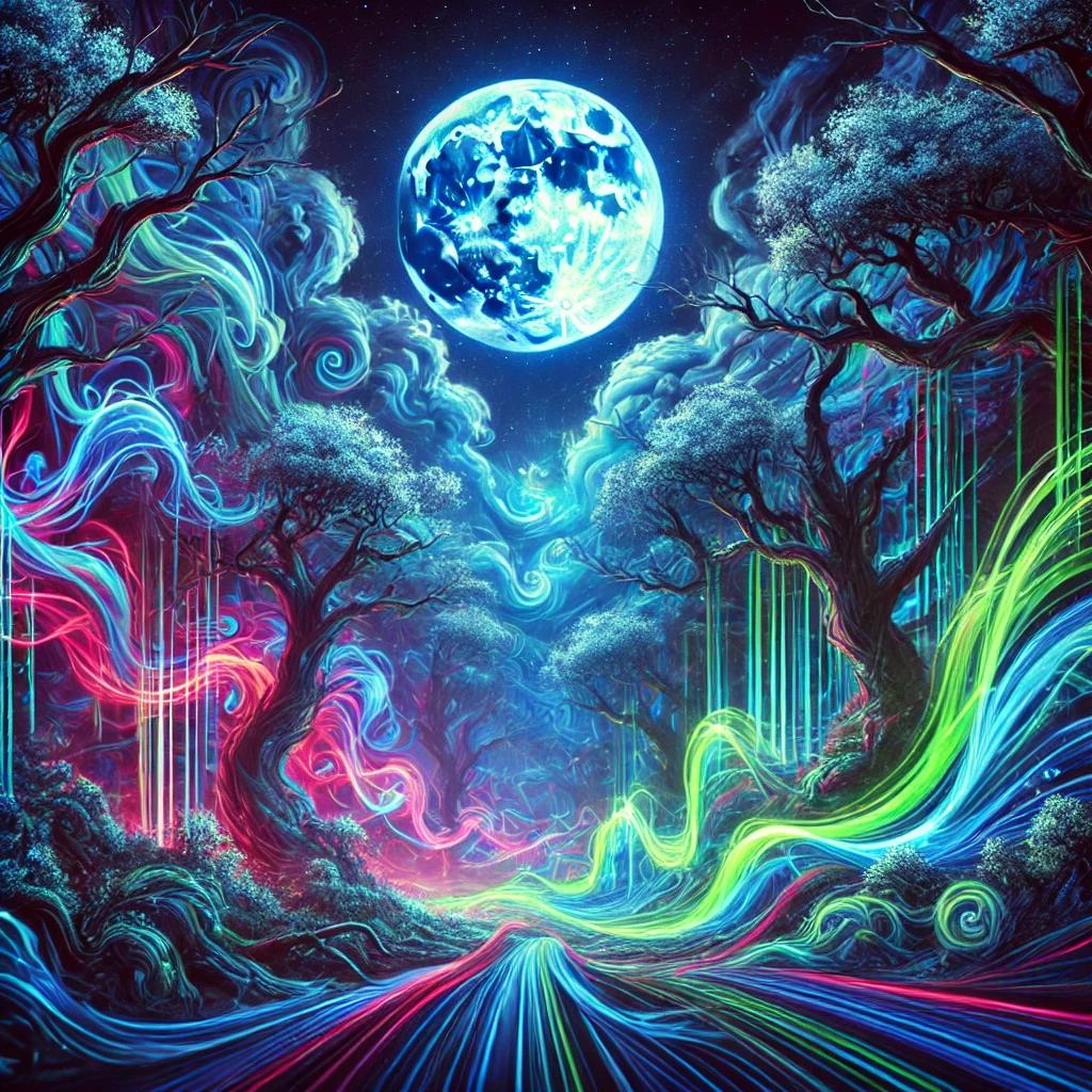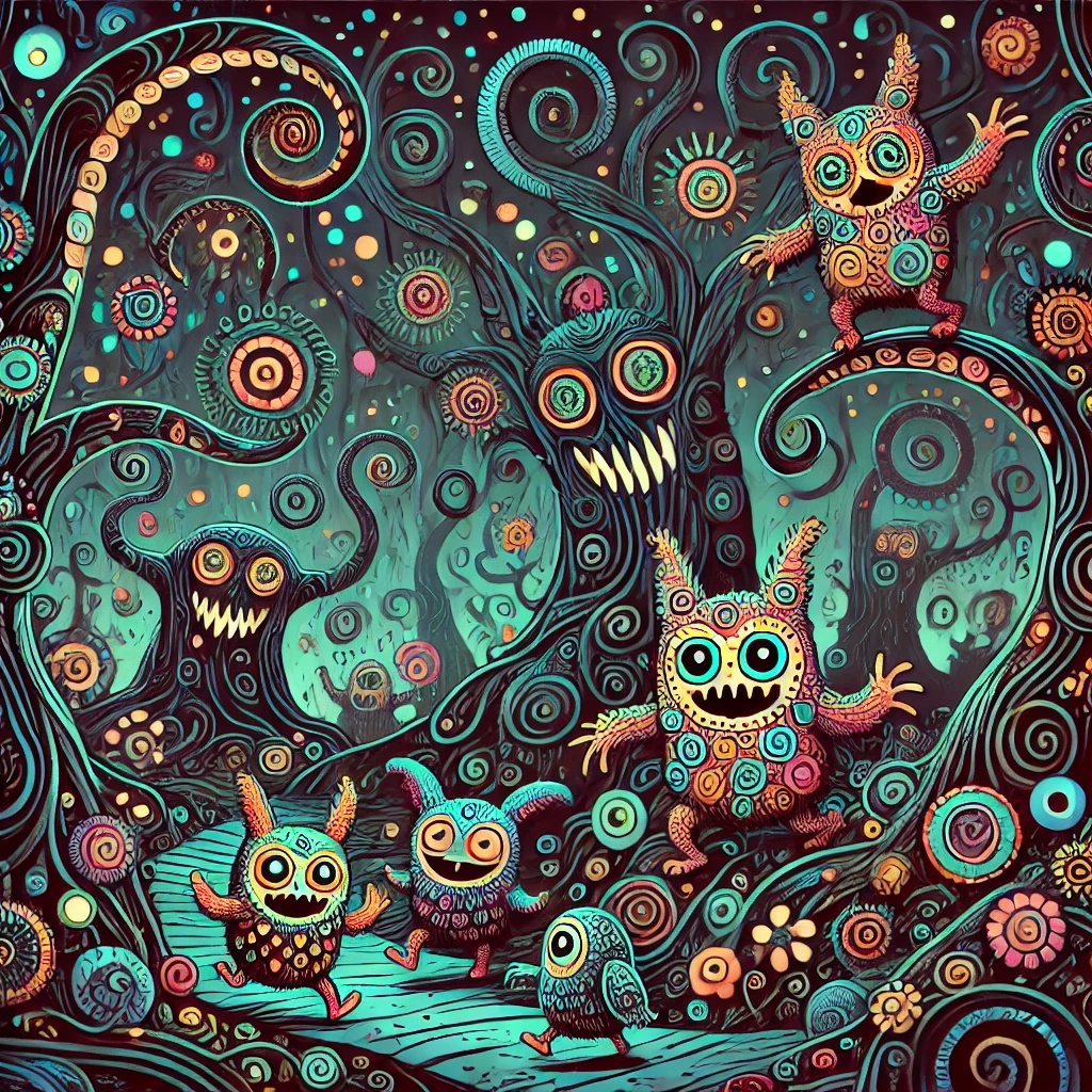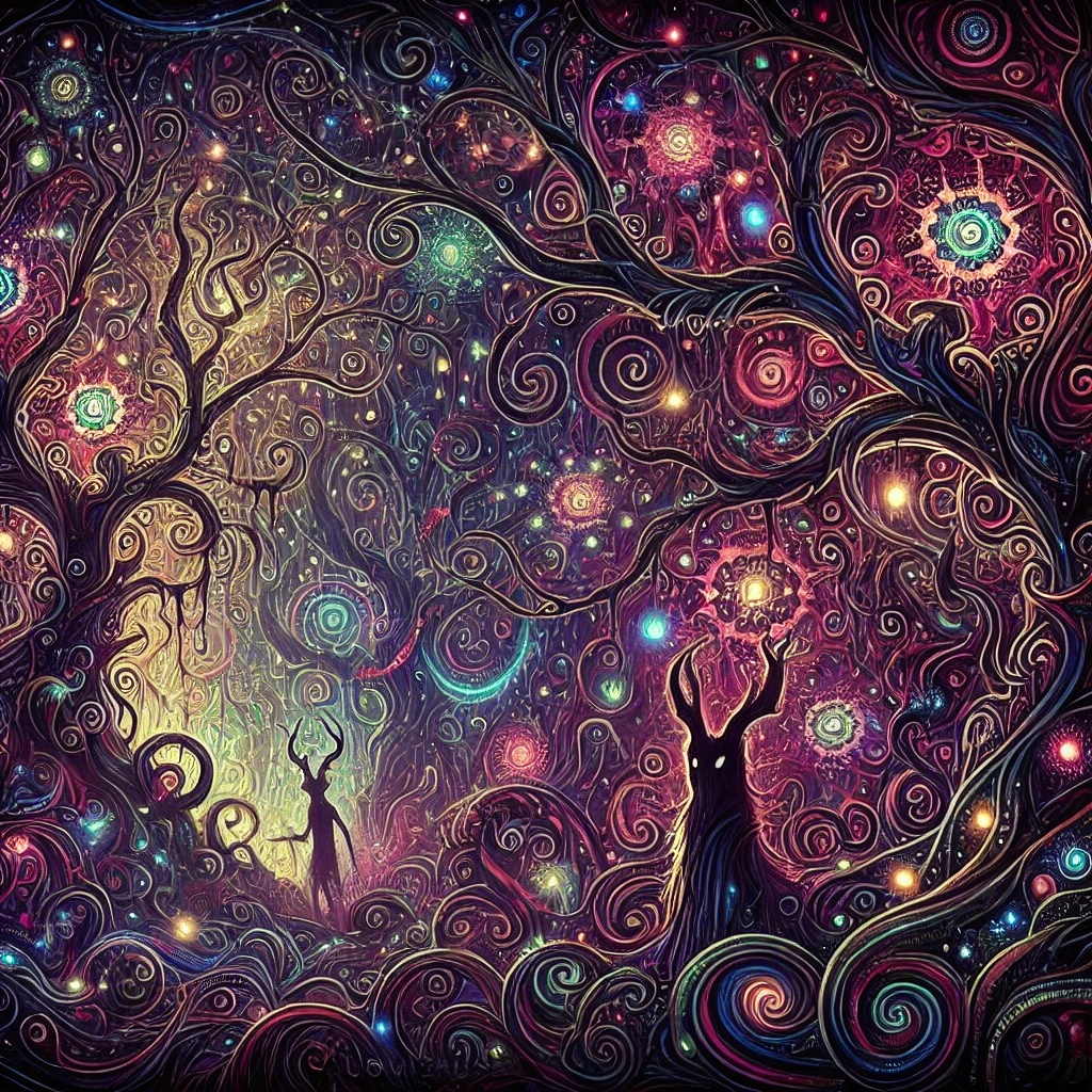 darkpsy, dark psytrance, quirky, unpredictable, forest, experimental, intricate, trippy, goatrance, playful, psychedelic