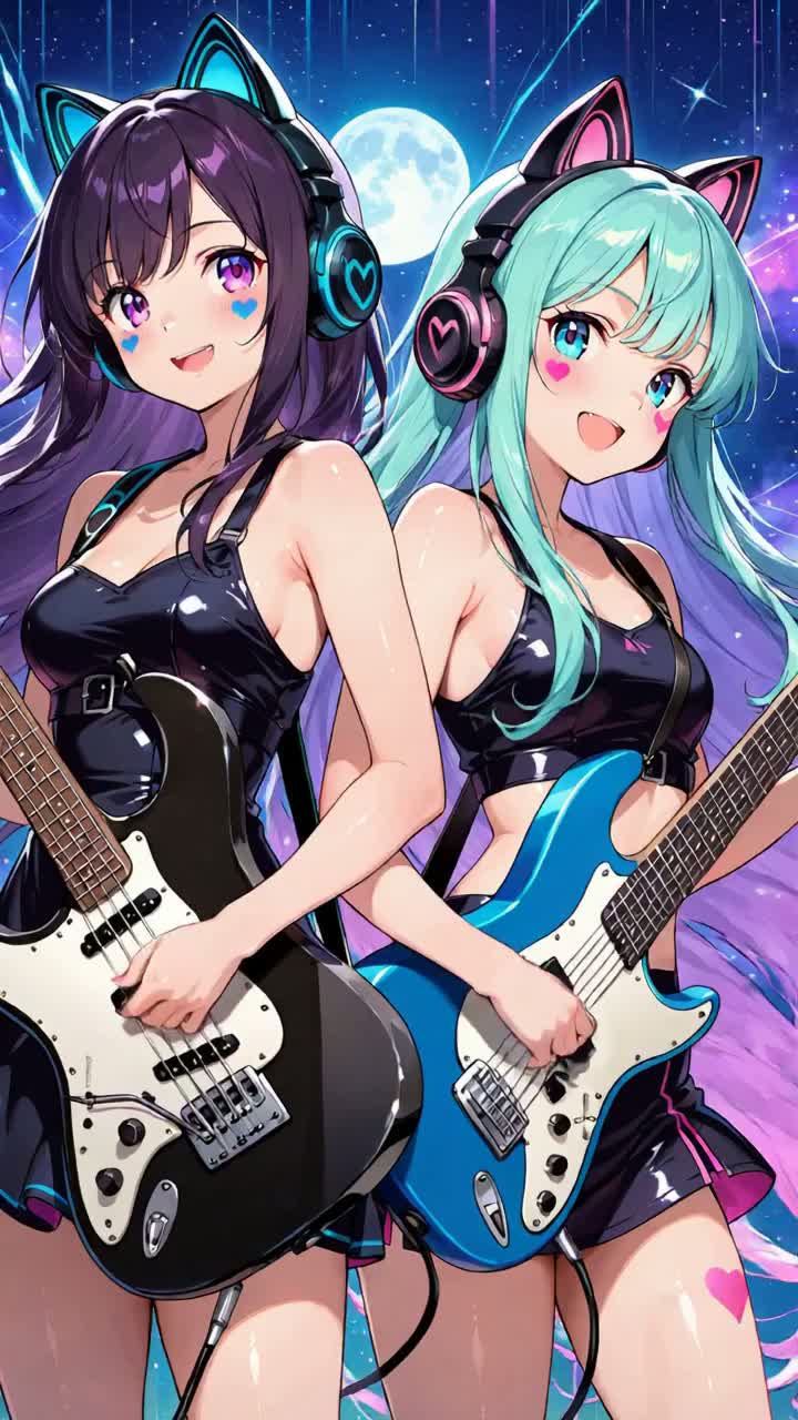 Japanese alternative rock with aggressive, percussive guitar cutting and sharp rhythmic accents, The mix is tight and dry, with clearly separated instruments and minimal reverb, Guitars are angular and staccato, drums are fast and punchy, and vocals are raw, urgent, and rhythmically delivered, The overall sound is edgy, tense, and exhilarating, with sudden dynamic shifts and bursts of noise, Occasional cute backing vocals and whispered phrases add a surreal, playful contrast—like a candy-colored voice drifting through a collapsing galaxy