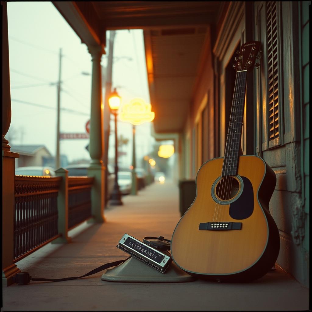 acoustic blues guitar with harmonica fills, bass and percussion support