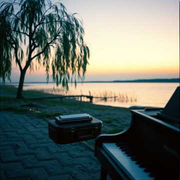 acoustic fingerstyle steel string guitar with harmonica fills, blues piano, bass and percussion support