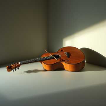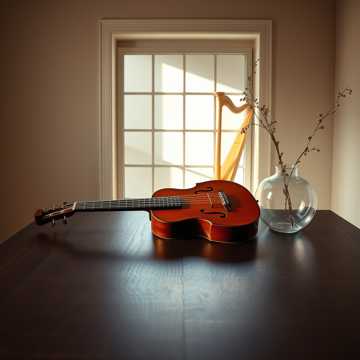 A classical guitar leads with intricate fingerpicking, its warm tones center stage, Gentle strings—violas and cellos—provide a soft harmonic cushion, occasionally joined by light woodwinds, The orchestration remains delicate, enhancing the guitar’s nuance without overpowering it