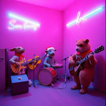 Atmosphere: night party, neon lights, dancing, festive and humorous
