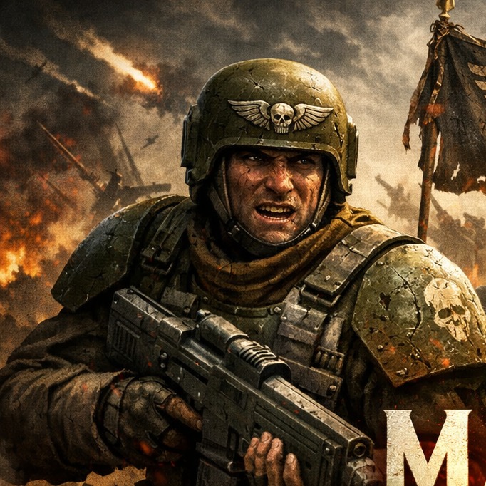 Grand cinematic military metal, slow burn intro, grimdark war anthem, spoken general speech at the start, deep male vocals, massive gang chorus, marching snare drums, low brass, war horns, distant artillery, choir, heavy guitars entering later, huge battlefield rise, heroic but tragic, powerful final chorus, slow build from solemn march into epic war anthem, Warhammer 40k Astra Militarum inspired, dark orchestral metal, thunderous percussion, disciplined marching rhythm, massive reverb, ending in glorious exhaustion