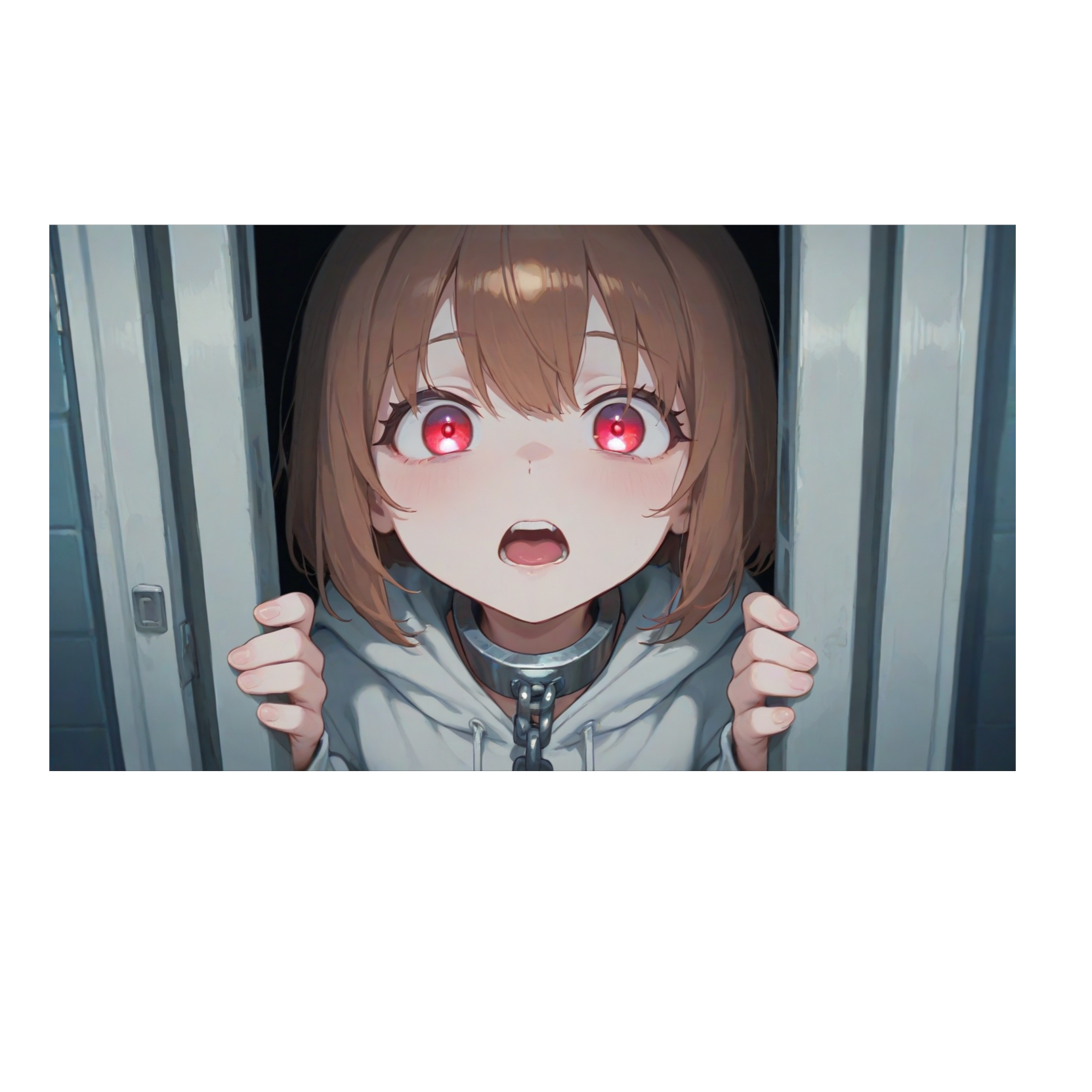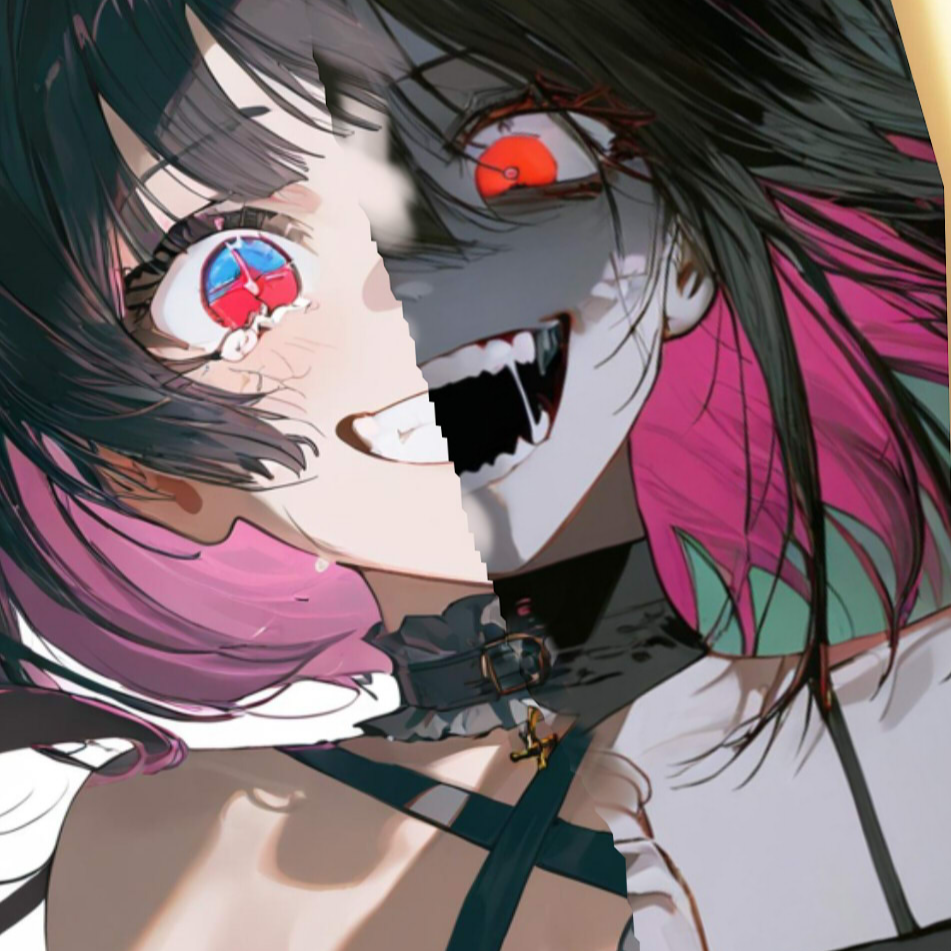 dreamcore anime hyperpop, Opening with eerie ambient textures, distant metallic clangs, and distorted music box melodies, the track unfolds with pounding industrial drums and weighty, glitched bass growls, Female vocals contort between lullaby whispers and manic, demonic roars, Layers of cinematic synths heighten the horror, with frantic rhythmic drops in deathstep style propelling chaos, shifting between melodic passages and jarring insanity, The outro retreats into unsettling, minimalist ambience
