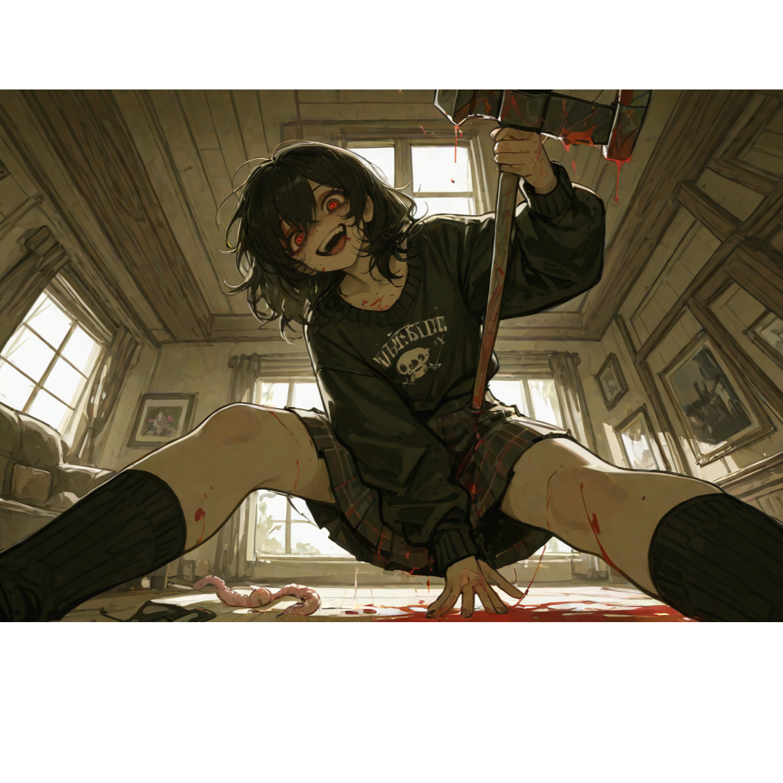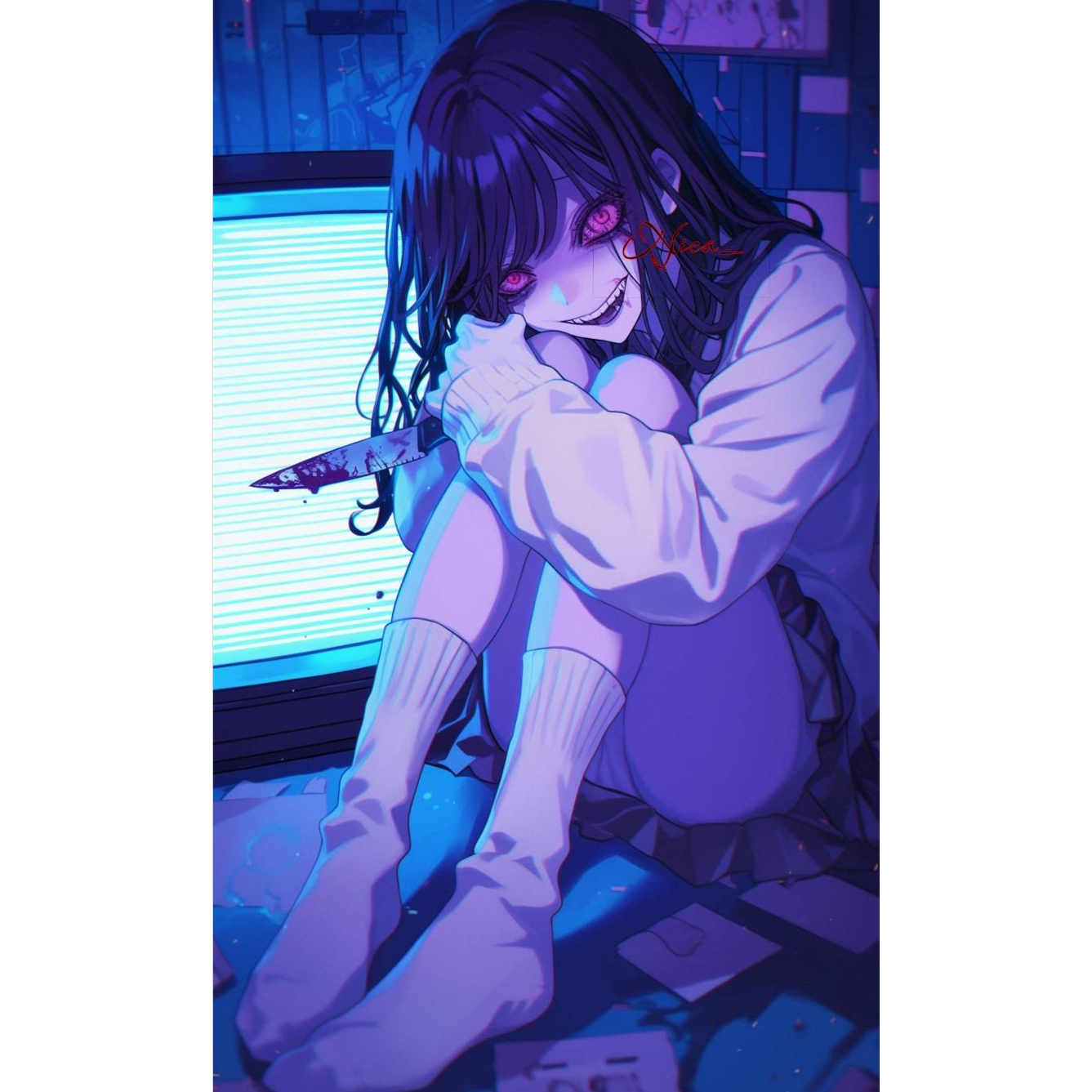 Aggressive distorted synths launch into staccato rhythm, layered with pounding drums and sharp metallic guitar, Female vocals alternate between sweet, airy melodies and intense, Twisted, yanderecore, kawaii, horrorcore, yanderecore, kawaii, kawaii