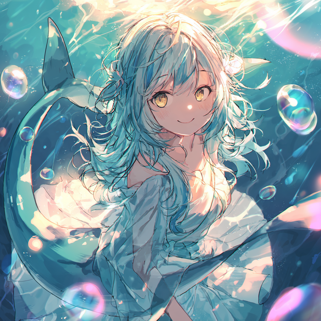 Vocal: Japanese female vocal, airy and translucent yet warmly expressive with soft husky tone, clear articulation, stable pitch, no switching; emotional lift in choruses with open phrasing, Instruments: glassy synth arps like sonar pings, smooth 808 sub-bass with mild distortion, liquid pads, bright glitch sparkles, bit-crushed percussions, reverse clean guitars, soft organ pad, micro textures, vocal shimmer, and dolphin-like synth calls echoing through the hall, Features: Catchy intro with gentle waves and reflections → dreamy verse floating like inside an aquarium → bright chorus with deep 808 pulse and expanded vocal shimmer → calm verse with reverse reflections → final chorus expanding all layers like a glowing wave → fade into oceanic ambience, Mood: calm yet radiant — like a digital ocean dream echoing through a quiet aquarium