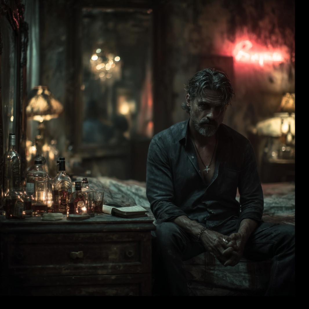A slow, emotionally raw acoustic ballad featuring a gritty, vulnerable male vocal, The performance should feel like a confession whispered at 2AM in a roadside motel—filled with regret, humility, and the faint glow of grace, The verses are carried by a fingerpicked acoustic guitar, dusty and intimate, with ambient reverb and soft tape hiss textures, A mournful slide guitar adds emotional color in the background, Light piano enters in the chorus with atmospheric pads and minimal percussion—brushed snare and warm kick only, The mood is late-night, spiritual, and broken-but-reaching, Lyrics focus on personal failure, longing for redemption, and hearing echoes of a mother’s prayers in the quiet, The final chorus swells slightly with soft vocal harmonies and gospel-inspired warmth, Tempo around 68 BPM, Key: D minor or G minor, Moody, cinematic, and introspective