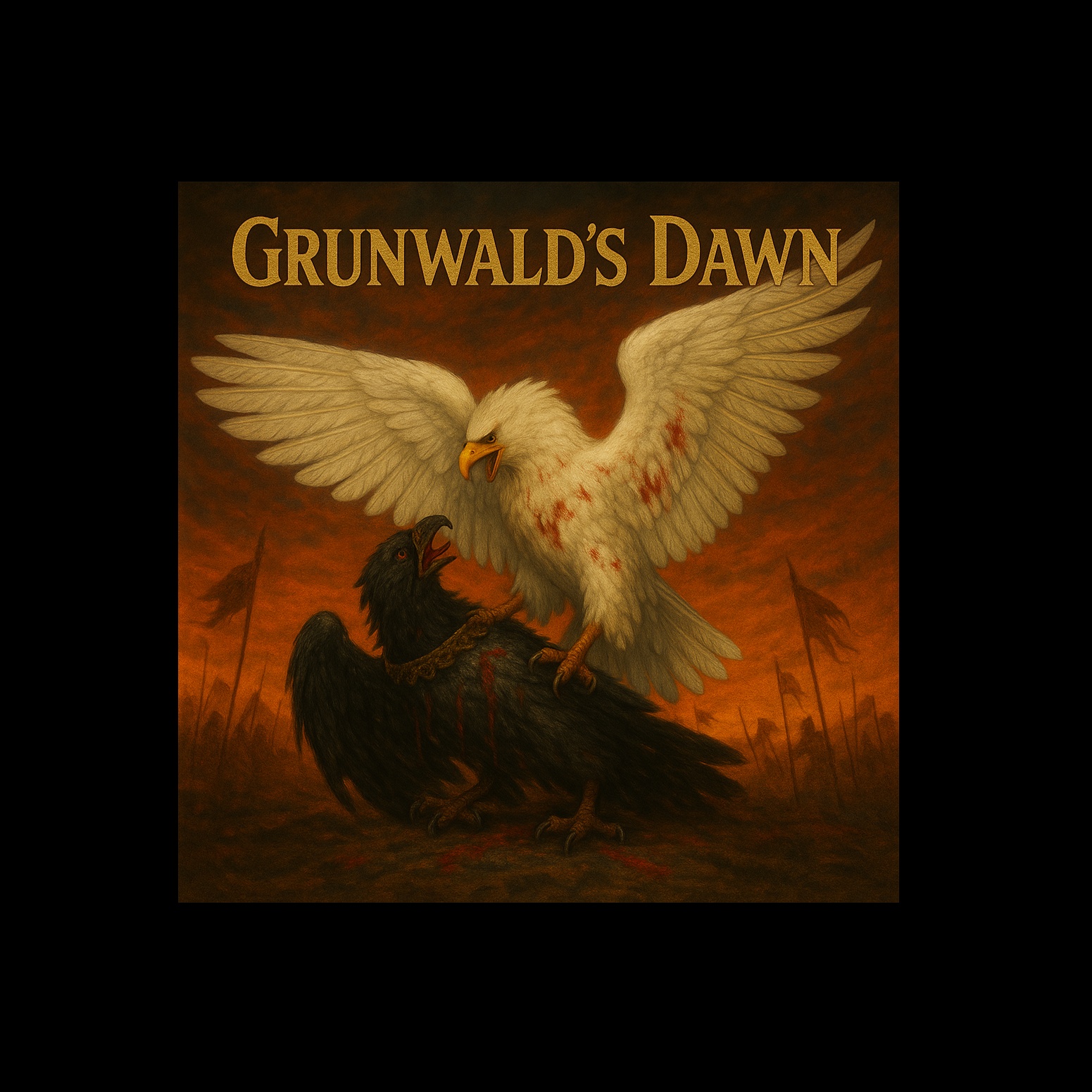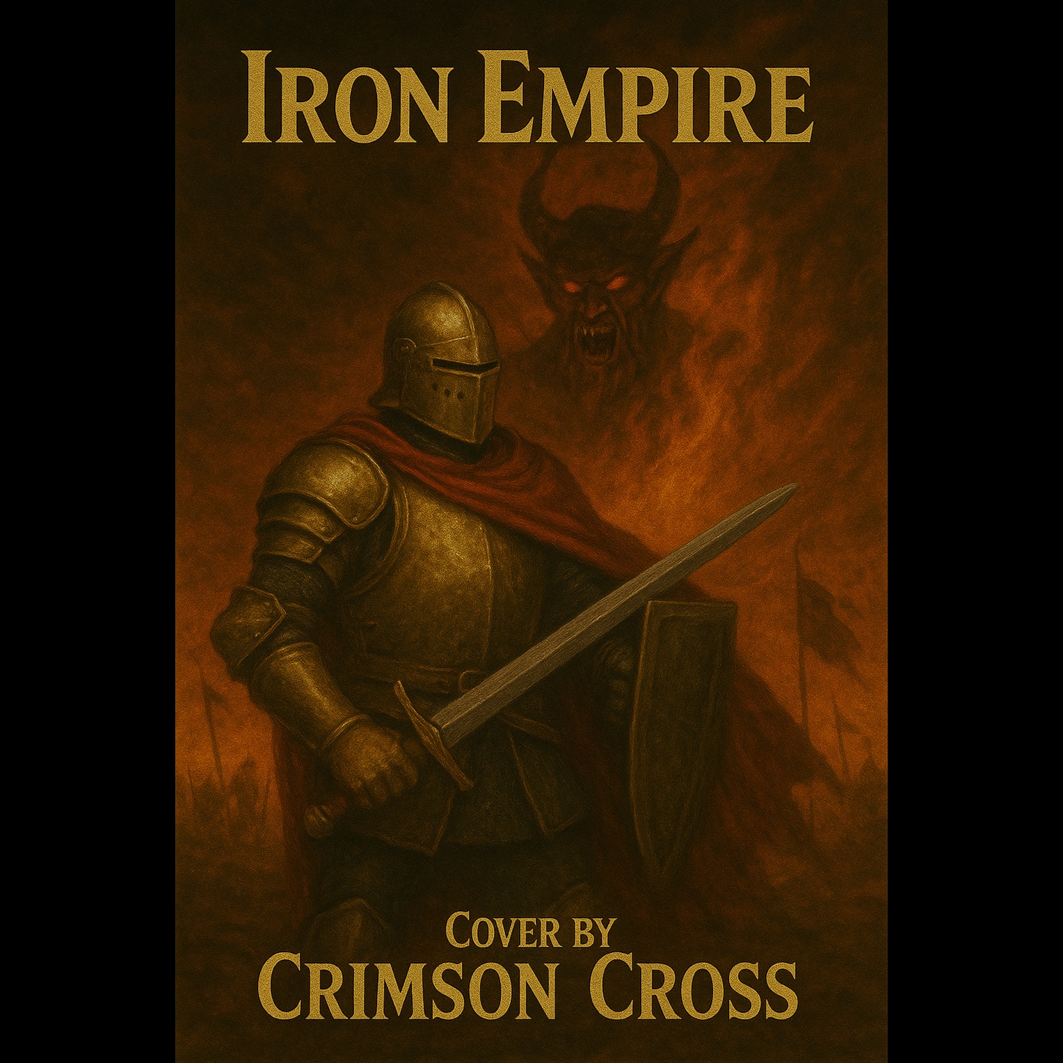 A bold symphonic metal anthem with pounding drums, chugging guitars, sweeping strings, brass fanfares, acoustic/harp interludes, powerful male lead vocals and soaring choir