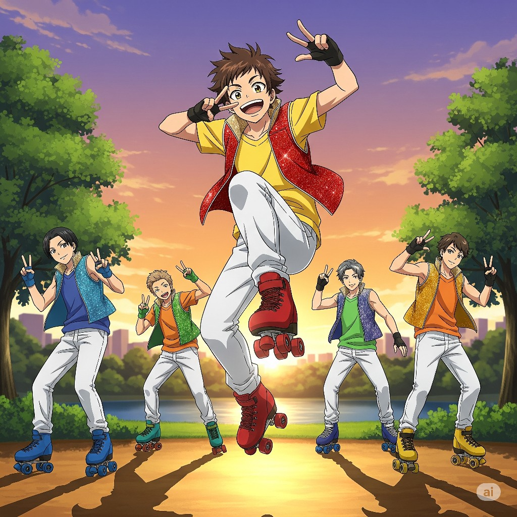 An energetic and nostalgic male idol-style J-pop song inspired by late 80s and early 90s sounds and kayokyoku, featuring bright electric guitars, punchy drums, light brass accents, and a driving synth bass, Vocals are youthful male solo with layered male harmonies in the chorus, Tempo around 138 BPM, cheerful and motivational mood, perfect for a retro anime or stage performance, Japanese language vocals with a clean mix and dynamic transitions between verse and chorus