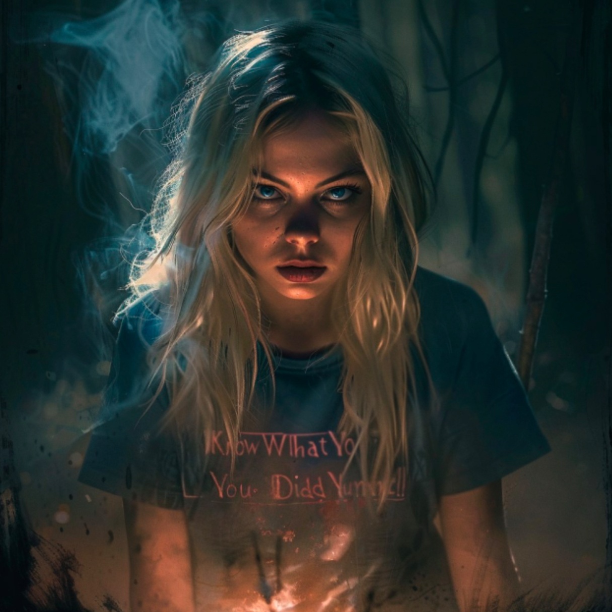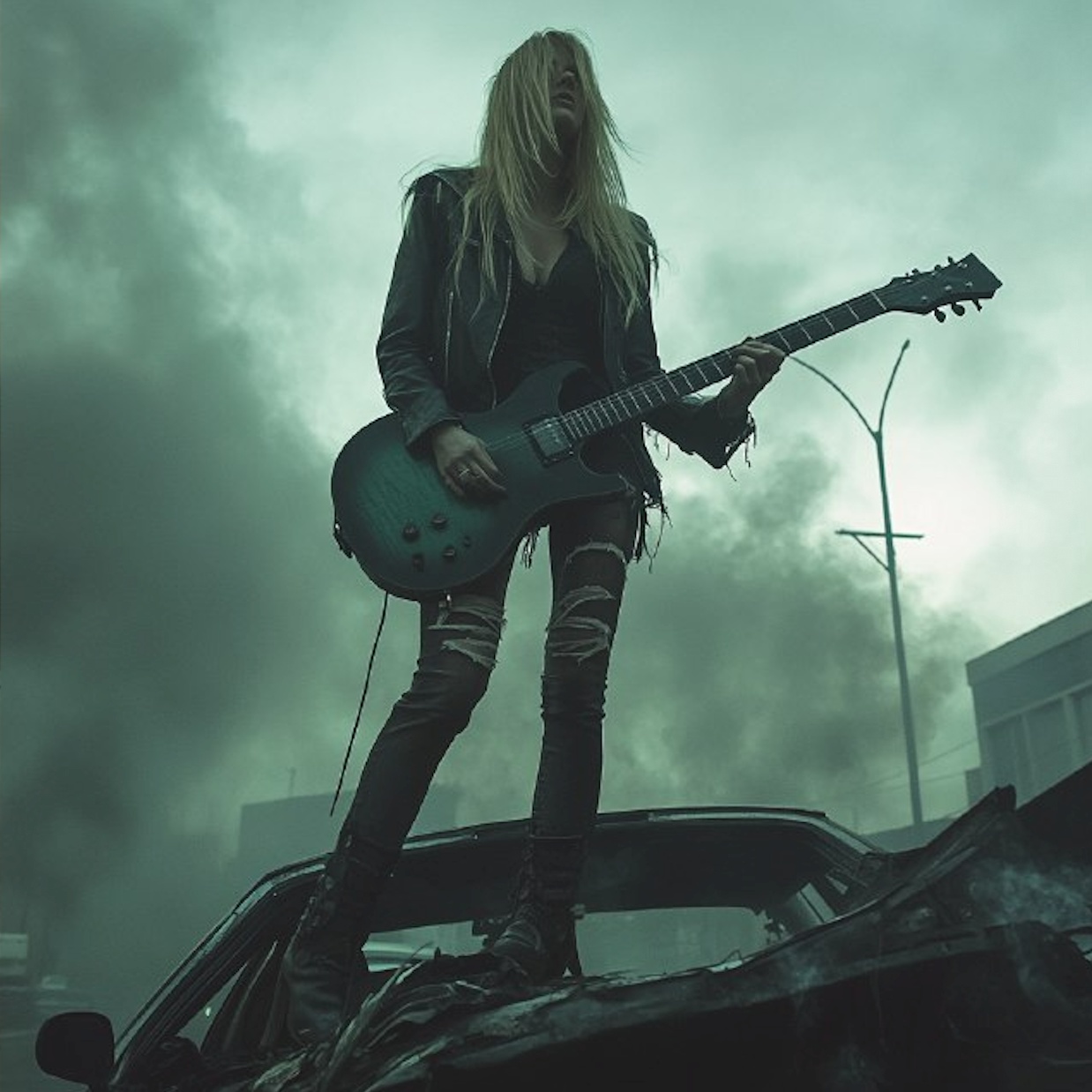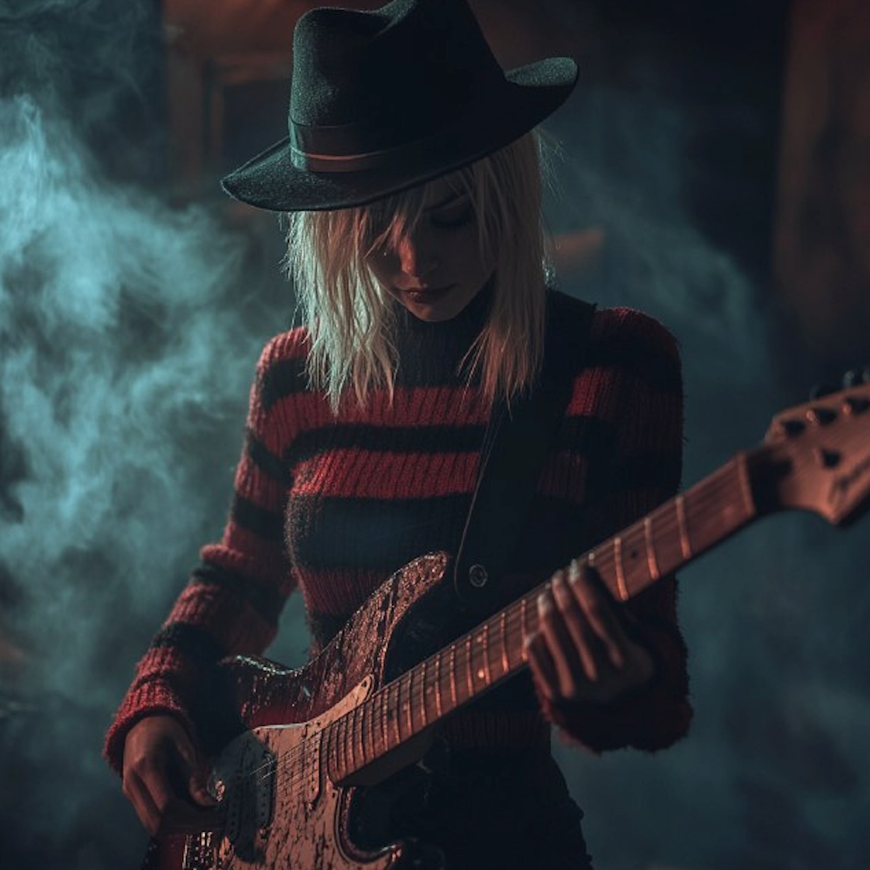 Halloween sound, Slow grunge riff, raw female vocals, dark, haunting tone, intense buildup