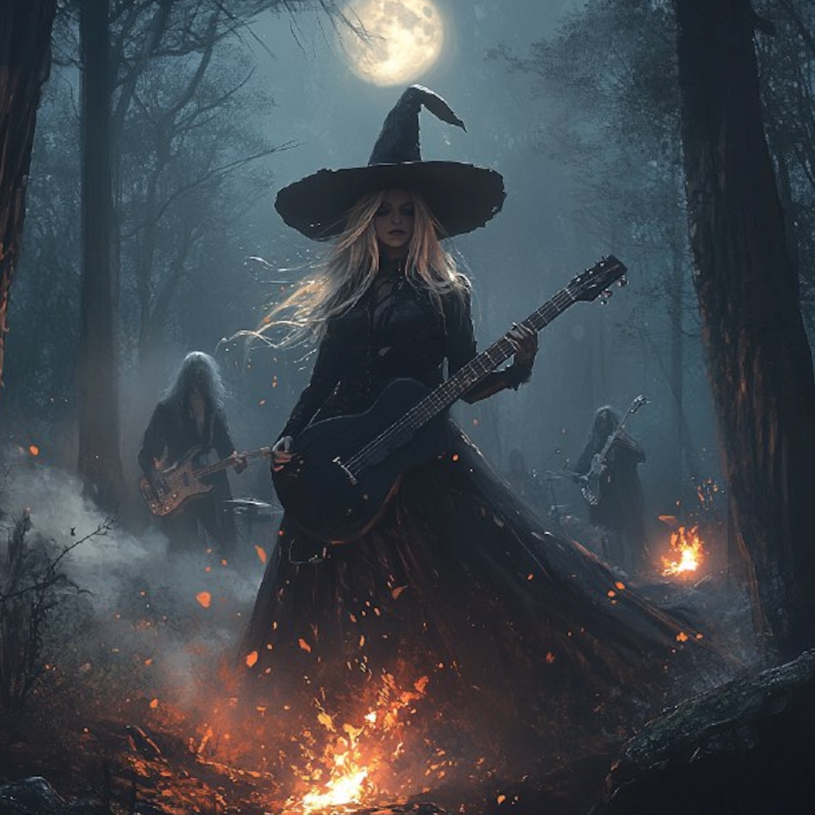 heavy metal, clean intro, dark atmosphere, heavy distorted riffs, intense drums, haunting, hypnotic chorus, female vocal