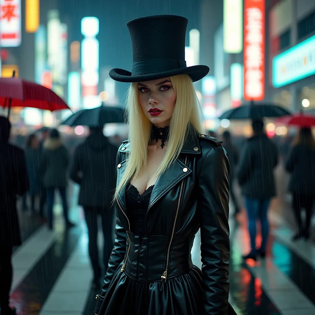 Mix dark cabaret with cyberpunk and breakcore, Female dramatic vocals, male fast-paced rap, chaotic energy