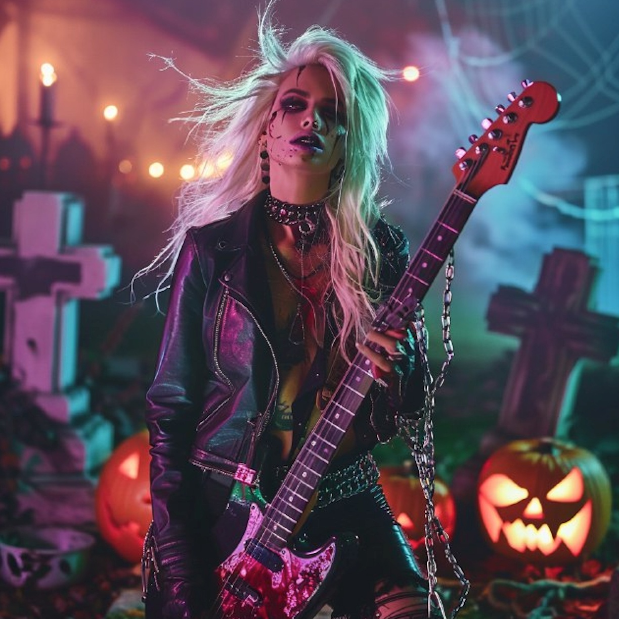 Haunted Halloween mood fast poppunk, festivale mood, symphonic orchestra, scream chorus, haunted disgusting female vocal