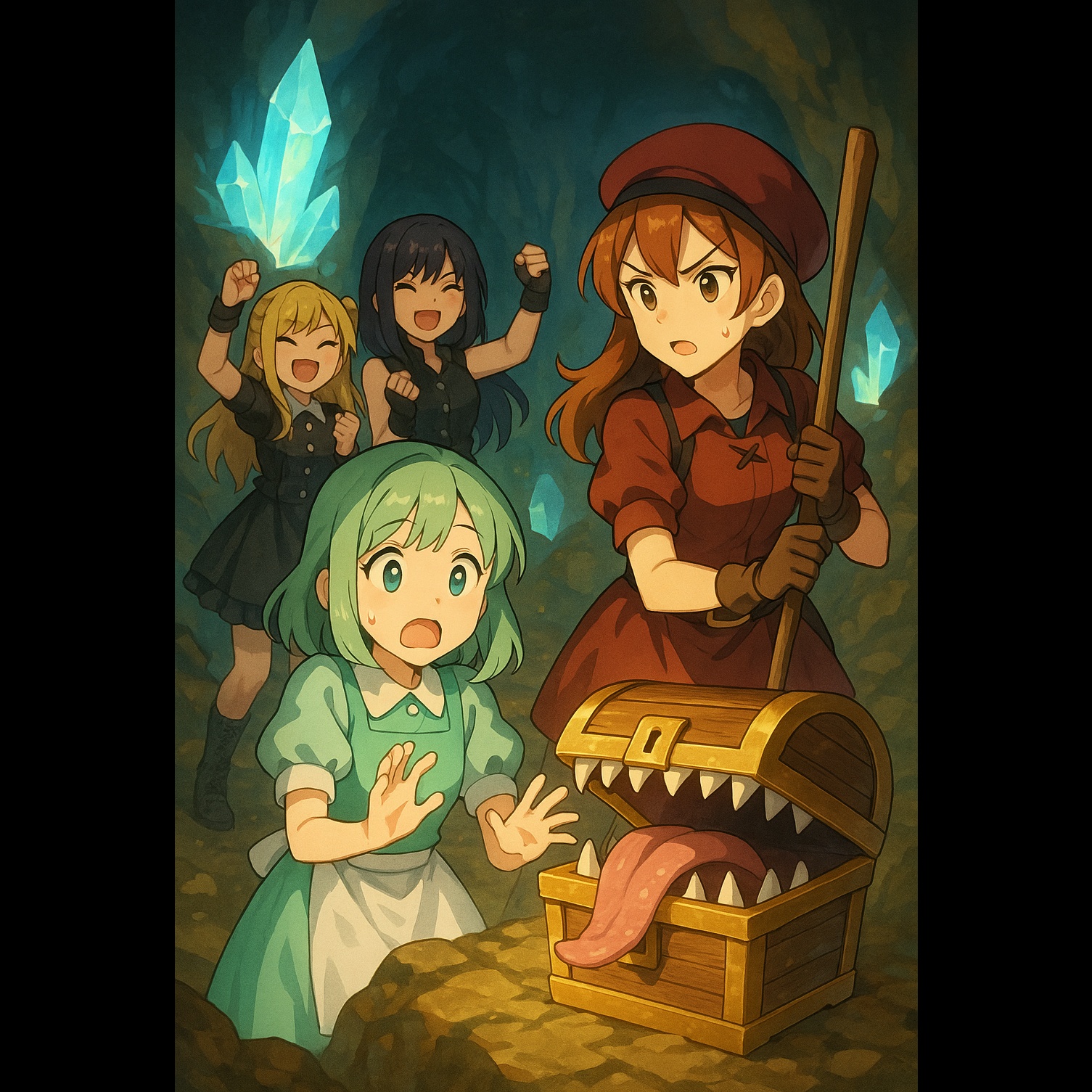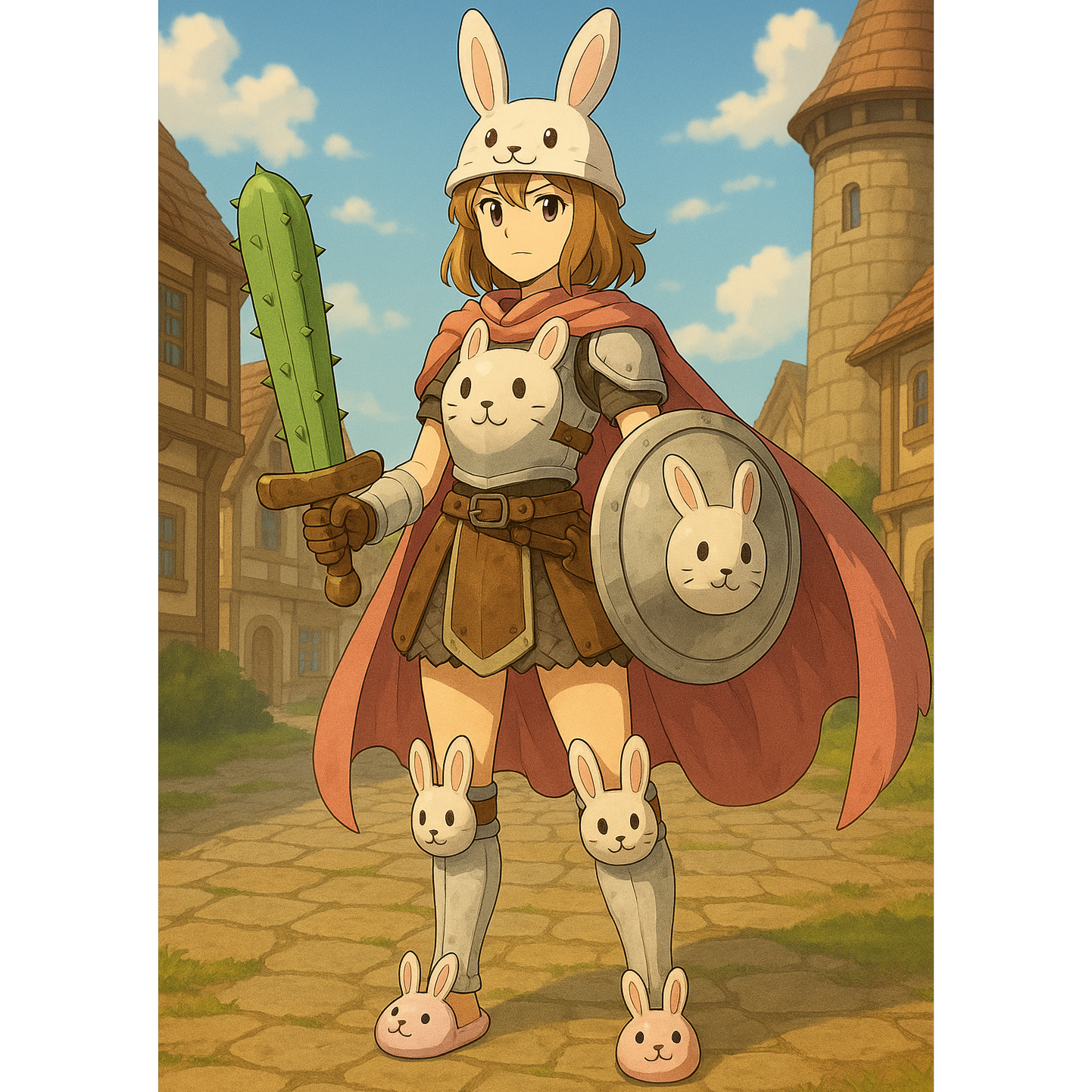 A funky, playful Japanese pop song about RPG characters wearing mismatched and ridiculous equipment for maximum stats, Anime-style female duet and beautiful harmonies, The arrangement is upbeat with slap bass, brass section, funky guitar, and drums, evoking a disco-funk groove, Mood: lighthearted, funky, and comical, Lyrics are entirely in Japanese with spoken parts included, ‑Teenage girls, ‑one calm and soft, ‑one energetic and bright
