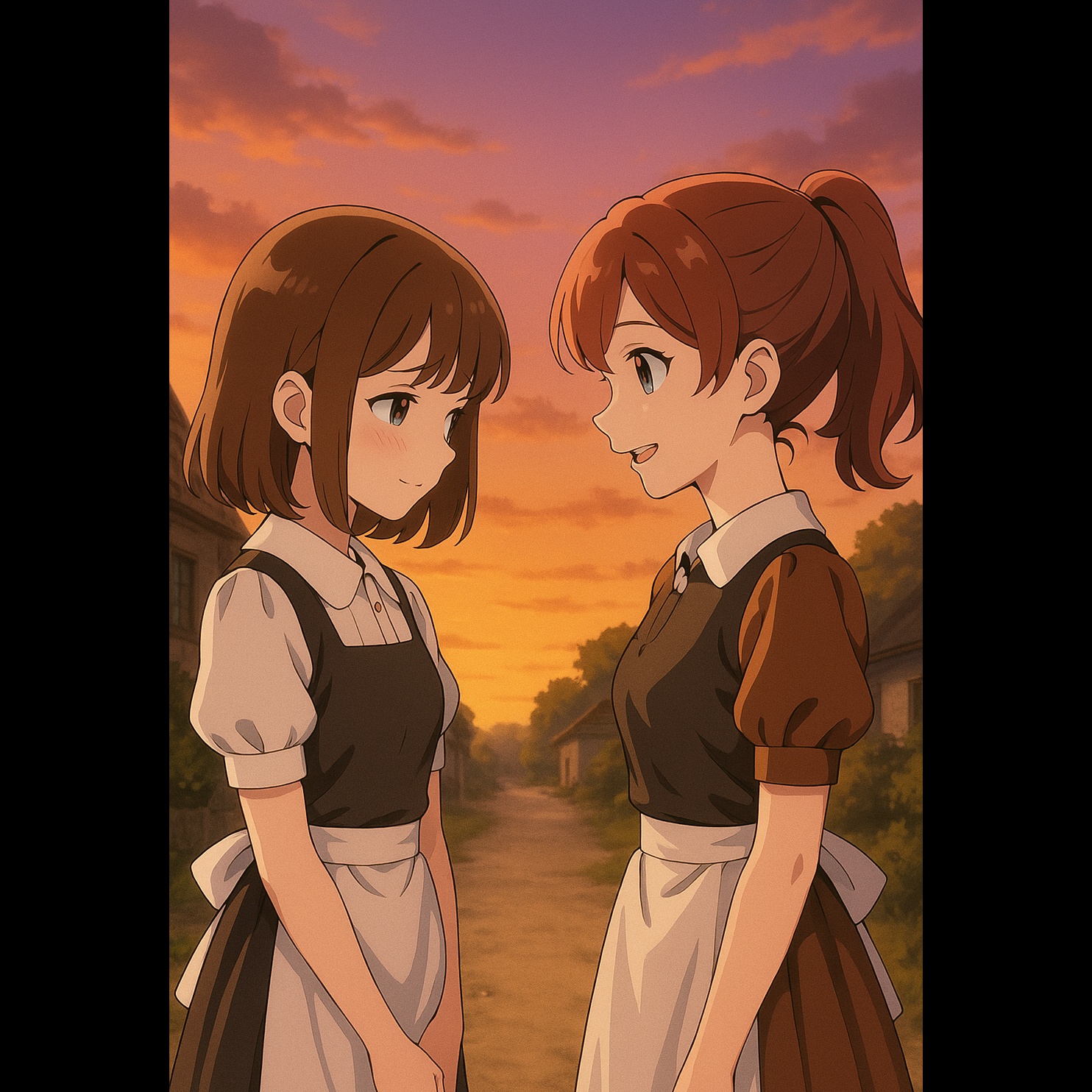 Wholesome acoustic pop, soft upbeat melody, anime slice-of-life style, duet vocals, teenage girl duet, one soft and warm, one playful and lively