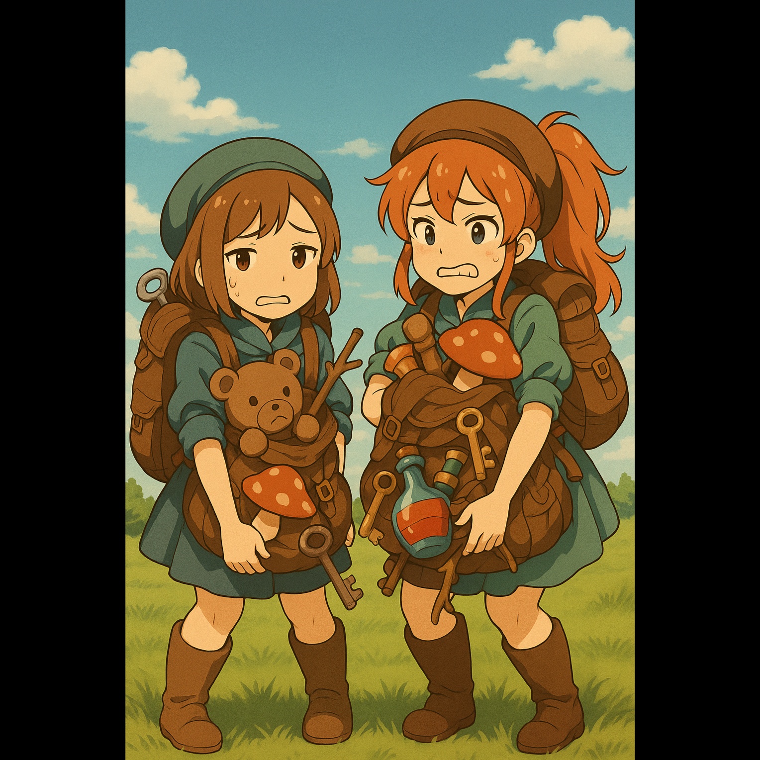 Fantasy anime ending theme with a mix of playful and emotional tones, light orchestration with acoustic guitar, strings, and rhythmic percussion, female duet vocalsAnime-style teenage girl duet, one cheerful and expressive, one soft and emotional, with playful phrasing and heartfelt harmony