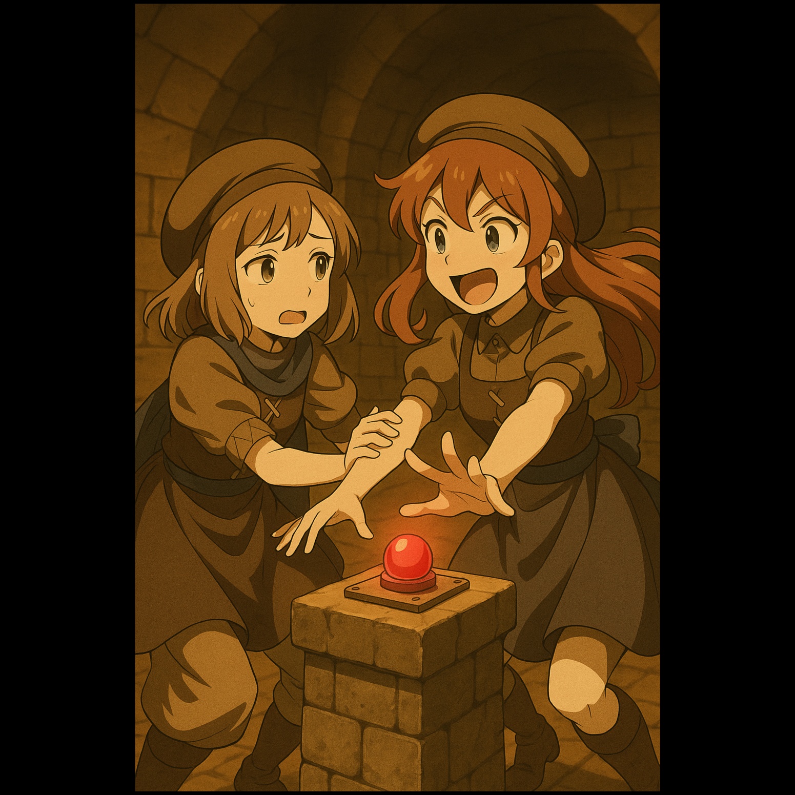Upbeat J-pop with RPG adventure vibes, energetic chiptune-inspired synths, catchy rhythm, and cheerful female duet vocals, teenage girl duet, one soft and optimistic, one lively and bold, with animated phrasing
