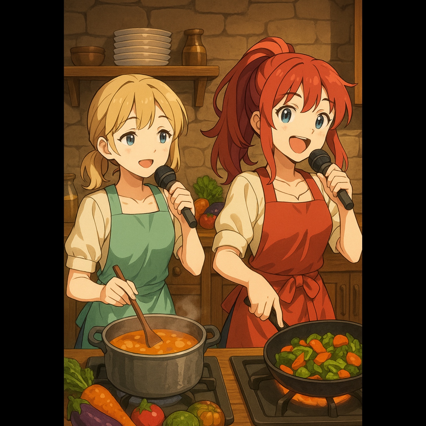 Anime-style female duet, one energetic and bold, one gentle and emotional, with expressive phrasing and playful timing