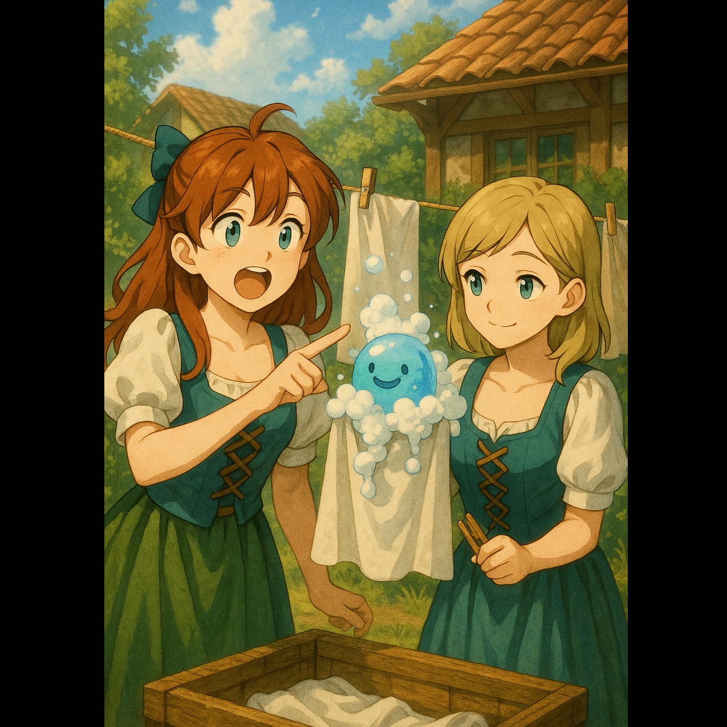 A cheerful and whimsical acoustic pop song with light Latin rhythms, featuring ukulele, upright bass, hand percussion, and playful xylophone, Female vocals sing a humorous story about a laundry day invaded by a friendly slime, Bright, bouncy, and filled with fantasy charm