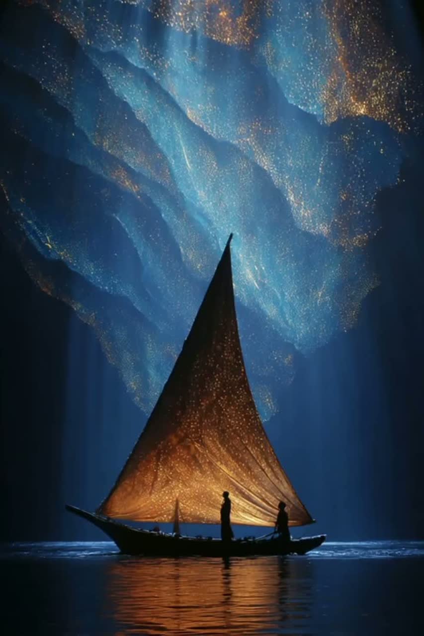 Epic orchestral overture, Sweeping cinematic score with tribal percussion, deep oceanic ambience, and soaring choir, Starts mysterious and haunting, evoking endless ocean horizons, Gradually builds into powerful orchestral swells with drums made of wood and skin, rhythmic water sounds, and choral harmonies chanting wordless vocals, Mid-section introduces brass and string motifs symbolizing human survival against the sea, Ends with a dramatic crescendo leading to silence and the distant cry of gulls and waves, Instruments & Texture: