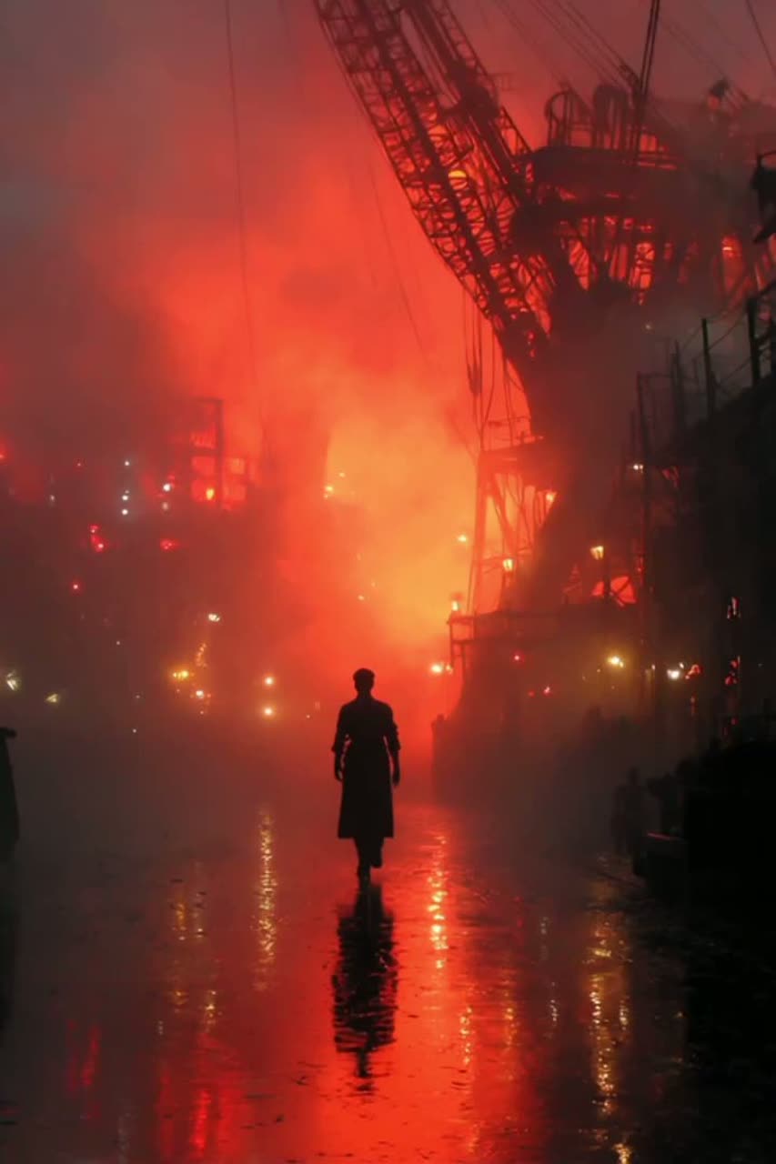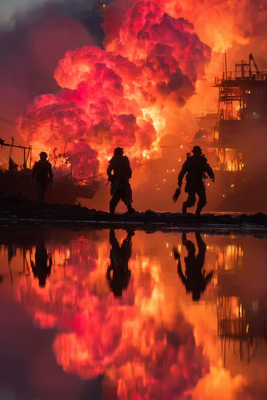 Explosive musical theater action scene, The Smokers attack the Atoll with pirate-shanty energy and industrial chaos, Male ensemble chant with pounding oil-drum percussion, distorted guitars, and metallic clatter, Shouted call-and-response lines from the Smokers’ captain, Midway, the tone shifts as Helen and the Mariner race to escape with Enola — orchestral strings and emotional duet under fire, Ends with their boat breaking through the flames and the Smokers fading behind, Sound / Instrumentation: