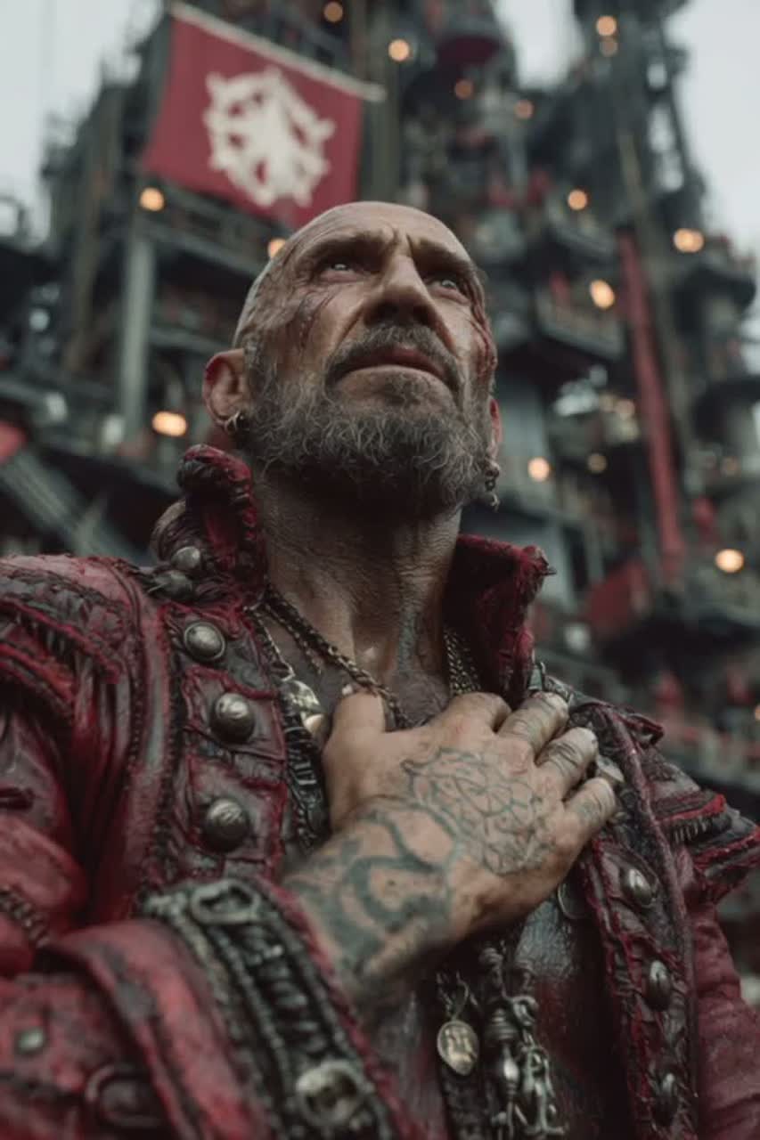 Chaotic, pirate-industrial, cinematic, fierce, theatrical