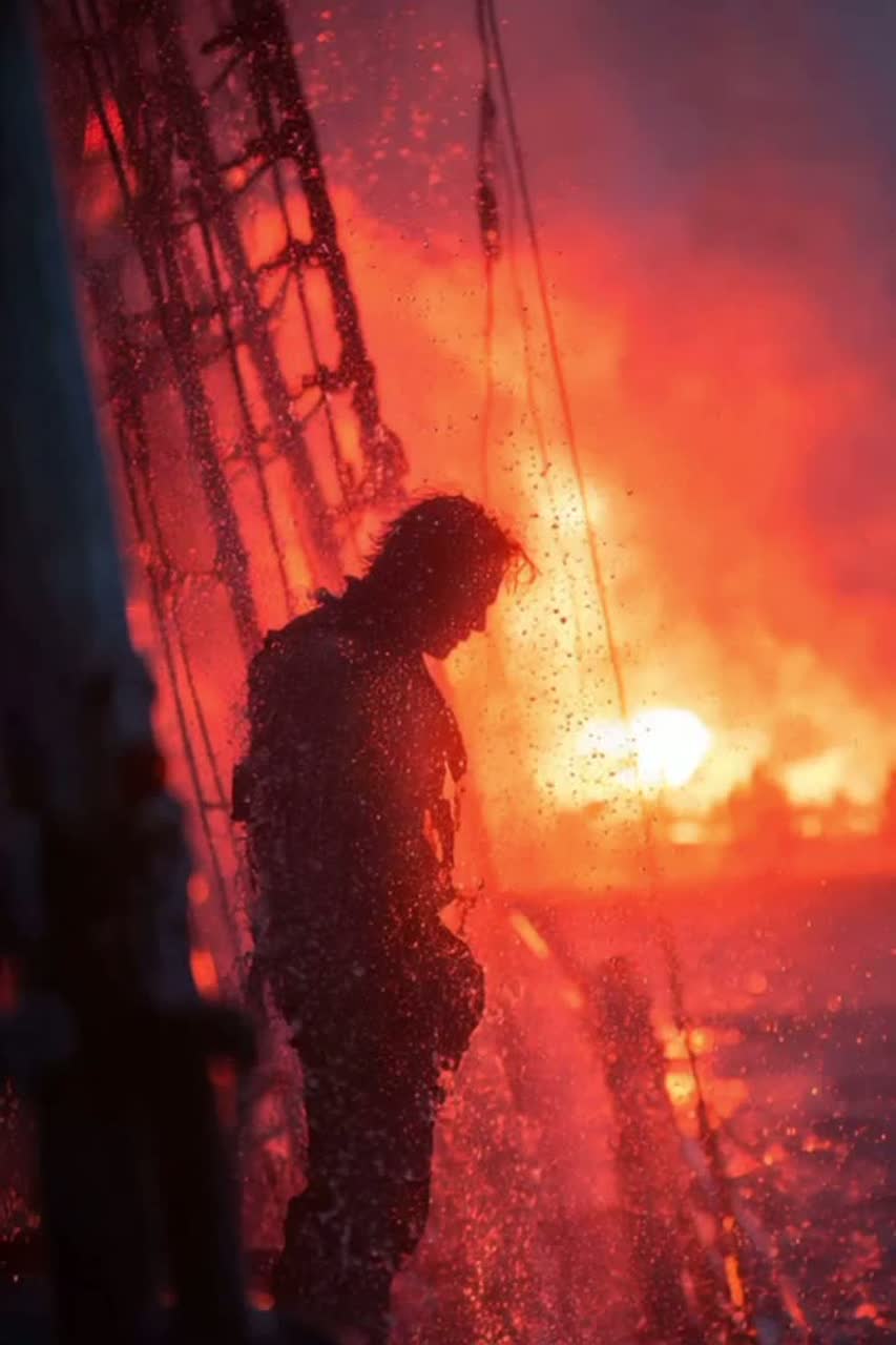 Act II climax song from a musical, Massive cinematic suite blending action and emotion, The Smokers attack and destroy the Mariner’s boat; Helen and Enola are captured, The Mariner kills to protect them, his ship burns, and he’s left adrift — realizing Enola has truly seen Dryland, Gregor rescues him as he vows to find her again, Orchestral rock-opera arrangement with layered percussion, brass, choir, and intimate vocal moments, Male/female leads with ensemble chorus, Sound / Instrumentation: