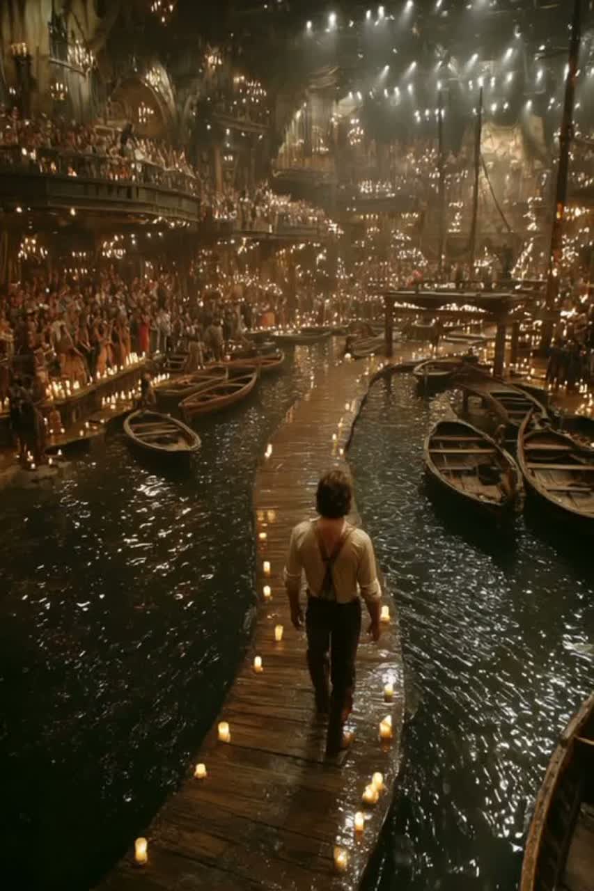 Large ensemble musical theater scene set in a floating city after the world has flooded, Tribal-cinematic score with energetic percussion, sea shanty rhythm, and dramatic chorus, Scene: The Mariner arrives to trade, but the Atoll crowd turns on him when they discover he has gills, Mix of sung dialogue, crowd chants, and underscored tension, Ends in chaos and capture, Sound / Instrumentation: