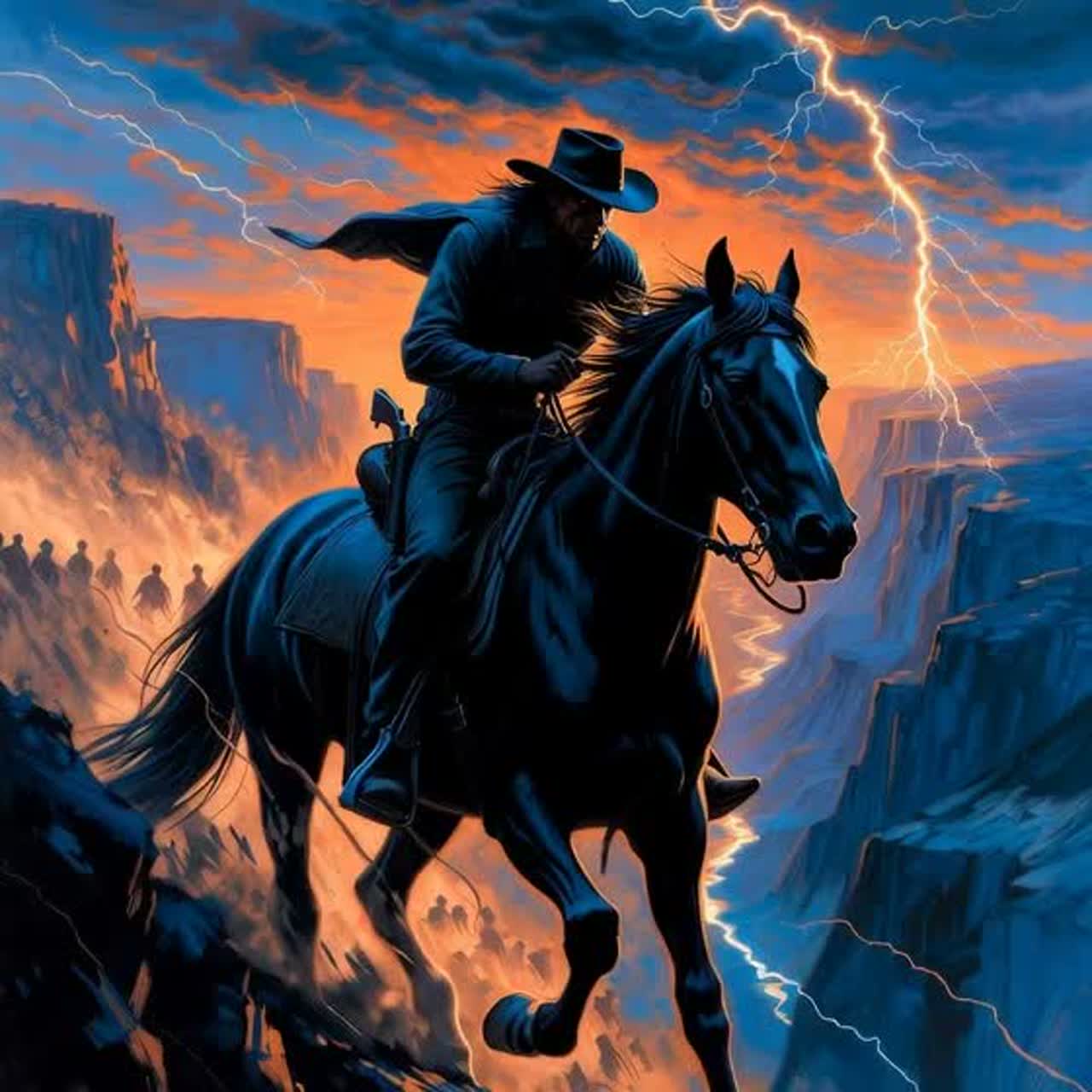 A high-energy cinematic country-rock anthem with a driving 4/4 rhythm at 145 BPM, The arrangement features gritty electric guitars with heavy overdrive, a prominent acoustic guitar strumming sixteenth notes, and a powerful drum kit with a deep, punchy snare and crashing cymbals, The bass guitar is thick and follows the root notes of a minor-key progression, primarily i-VI-III-VII, The vocals are a soaring, gritty male tenor with significant reverb and delay, often layered with tight vocal harmonies during the chorus, Orchestral elements including staccato strings and cinematic percussion hits add a dramatic, epic scale to the production, The structure follows a Verse-Pre-Chorus-Chorus-Verse-Chorus-Bridge-Chorus-Outro format, building in intensity with each section, Modern production techniques like sub-bass drops and filtered transitions are used to enhance the hybrid rock-country feel