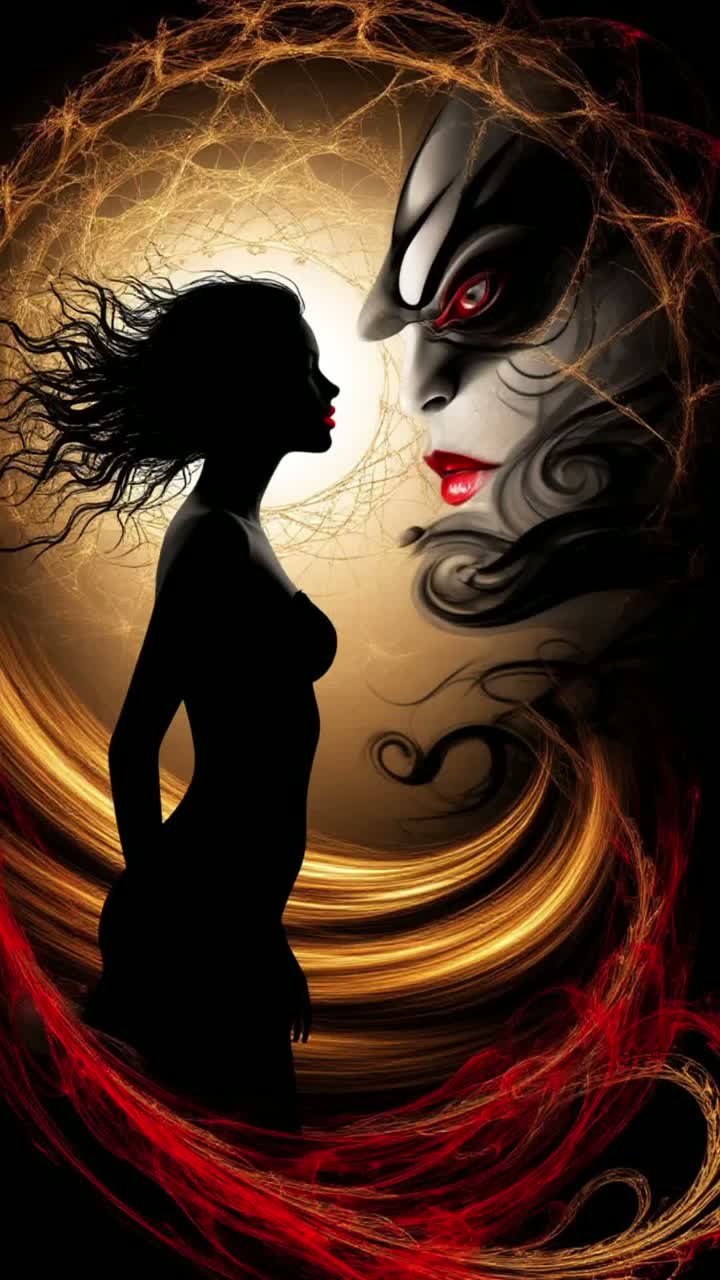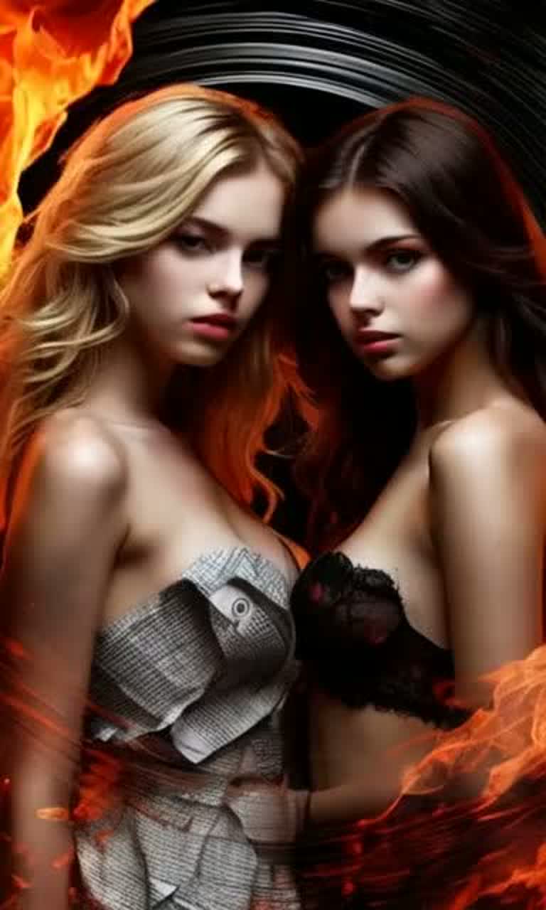 Edgy, dramatic duet for two female vocals, Fusion of jazz, punk rock, trance pop, and acoustic, One female vocal husky and raw, the other smooth and soulful, Alternating and overlapping voices, playful and theatrical delivery, Jazz-inspired drums, acoustic guitar, groovy bass, punky electric guitar, lush synths, strong saxophone solos, immersive pads, Verses are jazzy and, mysterious; choruses—anthemic and wild, packed with harmonies, call & response, Add strong echo and deep reverb for wide, surround sound, Saxophone shines in bridges and instrumentals, Energetic, immersive, slightly crazy mood, Tempo 90–110 BPM, Song shifts from mysterious and groovy to wild and hypnotic