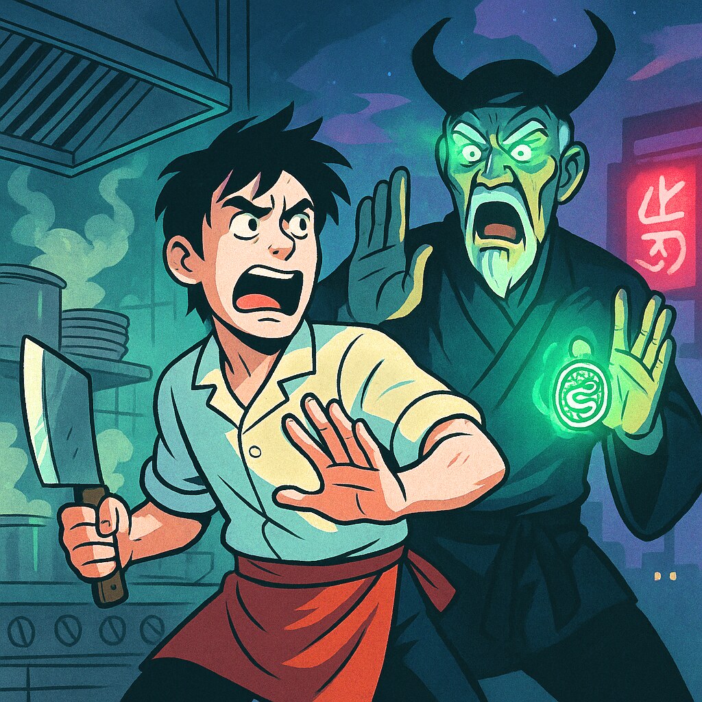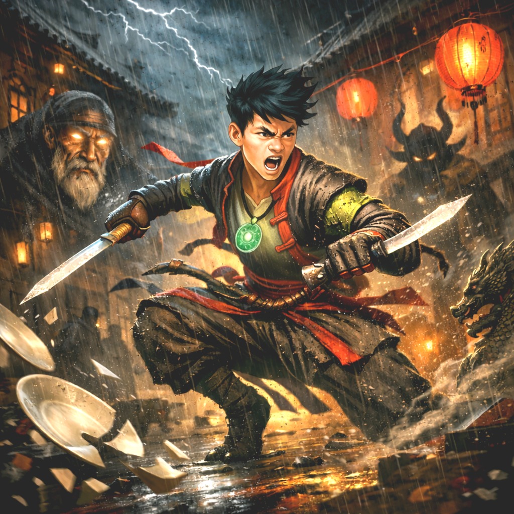 90s hardcore boom-bap hip-hop, underground street energy, heavy vinyl crackle, metallic DJ scratches, sharp turntable cuts, taiko-style war-drums fused with gritty snares and low 808s, fast pipa plucks with aggressive attack, wailing erhu bends, distorted dizi stabs, minor pentatonic Chinese war-scales, chopped guqin arpeggios like vinyl samples, rain-soaked lantern-lit alleyways, thunder rolls over rooftops, shadows and horned figures, jade chime percussion accents, smoky incense-haze ambience, cinematic wuxia tension, streetwise attitude, male vocals delivered with aggressive, punchy, cold-precision rap, hooks explosive and intense, sine-wave flow alternating short and long lines, per-line phrasing optimized for beat, section cues: [BREATHE] / [SCRATCH HIT] / [DROP], epic intro with erhu solo + DJ scratches, epic outro with jade chime fade