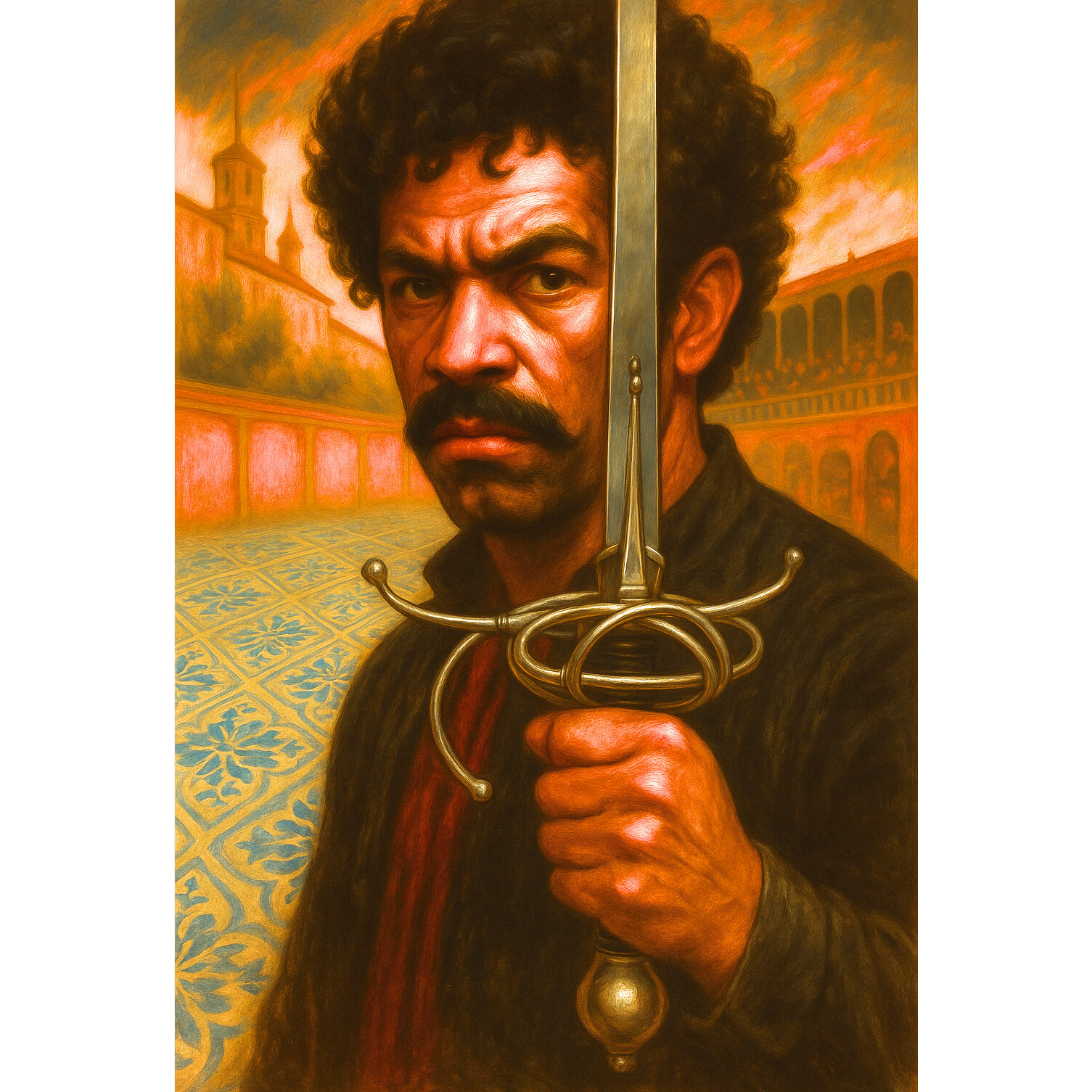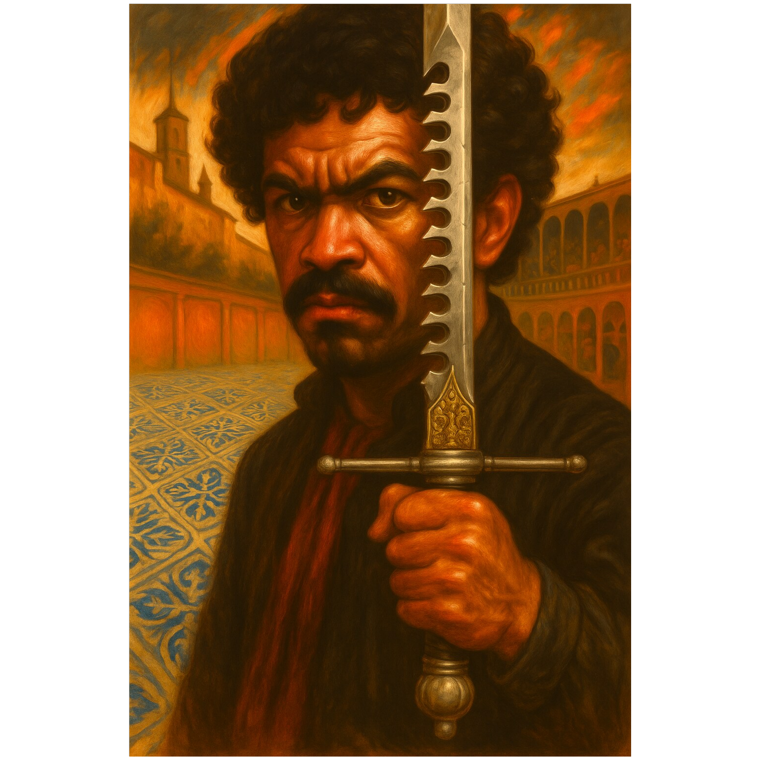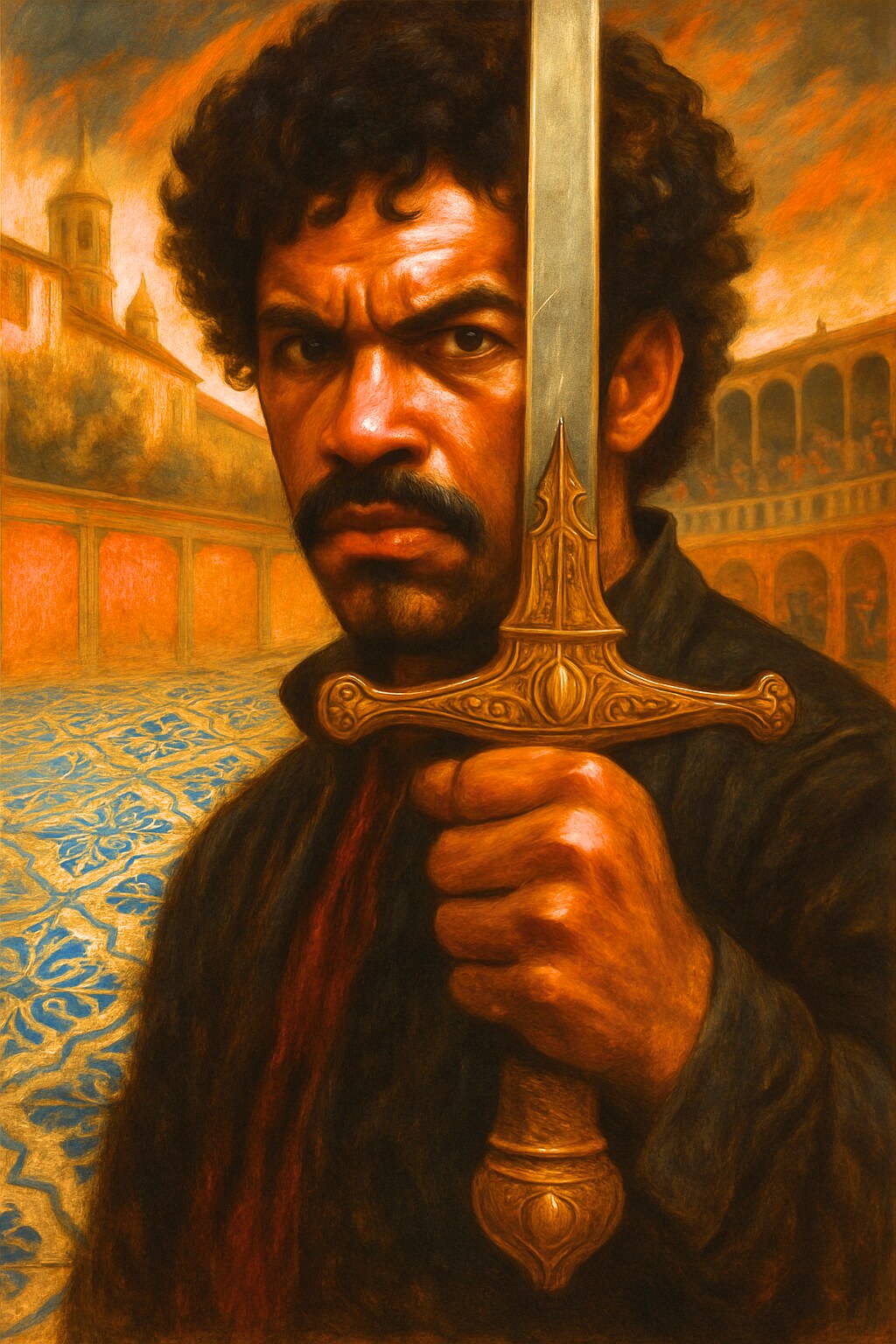 90s hardcore boom-bap hip-hop, ruthless underground rap energy, heavy vinyl crackle, aggressive turntablism cuts, metallic DJ scratches, deep sub-heavy bass reinforced with low-tuned 808s, flamenco guitar riffs plucked with sharp duende attack, palmas handclaps chopped like vinyl samples, corrida brass stabs, Iberian war-drum impacts fused with gritty snares, minor Phrygian Spanish battle-scales, tension-filled nylon-string arpeggios drenched in analog saturation, dusty tablao ambience, echoing footsteps on old cobblestone alleys, distant shouts from a late-night barrio, cape-whip flare accents like a matador’s pass, steel-forged espada unsheathing sound layers, cathedral-like stone reverb, hostile and cinematic tone, male vocals delivered with passionate fury, commanding presence, and sharp battle-rap precision