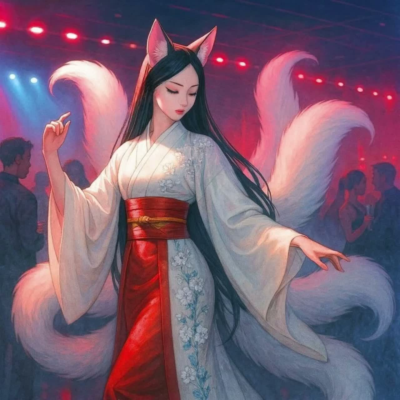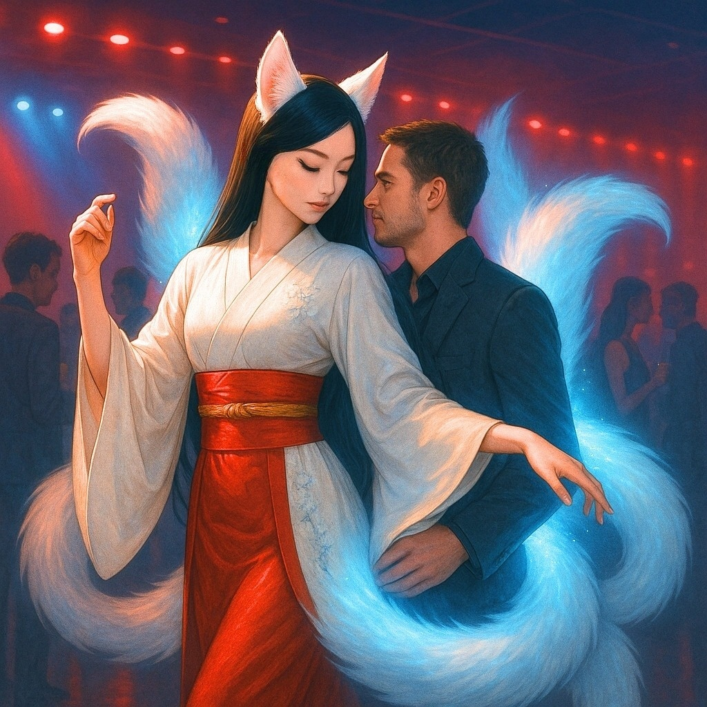 90s hardcore boom-bap meets nocturnal Korean myth, Dirty underground rap with harsh vinyl crackle, aggressive turntablism cuts, distorted DJ scratches, and heavy low-end kicks, Deep boom-bap drums and sub-bass pulse like a heartbeat slowly being stolen, Atmospheric synth pads drift like foxfire, with eerie shimmering textures inspired by the Gumiho’s tails, Korean traditional elements—subtle gayageum plucks, breathy daegeum flute exhale, and occasional janggu-style rhythmic hits—thread through the darkness like ancient magic beneath the beat, Mood is hypnotic, dangerous, and romantic: a doomed-love encounter unfolding in a secret Seoul club where red lights haze over the dancefloor, Male lead vocal: warm but gritty, storytelling delivery with tension and fatal attraction, Female whispers (the Gumiho): soft, echoed, haunting—half invitation, half warning, Overall feel: dark, seductive, mythic; modern urban grit entwined with elegant Korean folklore allure