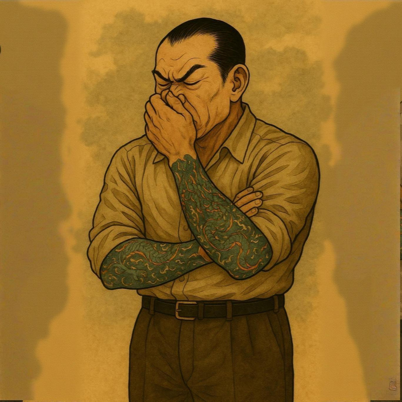 90s hardcore boom-bap hip-hop, ruthless underground rap energy, heavy vinyl crackle, aggressive turntablism cuts, metallic DJ scratches, taiko war-drum impacts fused with gritty snares, low-tuned 808 reinforcement, shamisen riffs plucked with sharp attack, distorted shakuhachi stabs, minor pentatonic Japanese war-scales, tension-filled koto arpeggios chopped like vinyl samples, Yakuza back-alley atmosphere, rain-soaked asphalt ambience, motorcycle revs, distant shouts, tanto unsheathing sound accents, gunmetal-cold reverb textures, hostile and cinematic tone, male vocals delivered with cold precision and menace