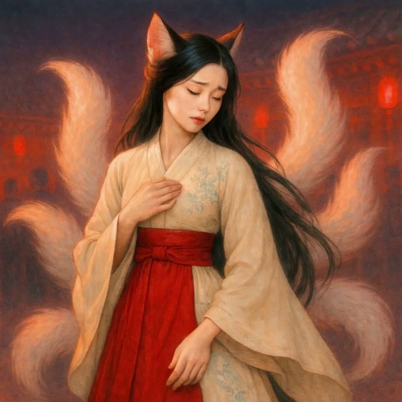 Warm, pained female vocal with soft airiness and emotional restraint, singing from the perspective of an elegant, tragic Gumiho, Slow, dreamy boom-bap beat with warm sub-bass, soft 90s drums, gentle vinyl hiss, and minimal DJ cuts, Ethereal foxfire ambience, shimmering pads, reverb-drenched gayageum plucks, airy daegeum flute accents, and light janggu hits, Nocturnal, romantic, mythic atmosphere—like a forbidden love scene in an underground Seoul club, Whispered Korean phrases (사랑해, 가지 마, 괜찮아) echo in the background, Overall tone: seductive, sorrowful, supernatural, graceful