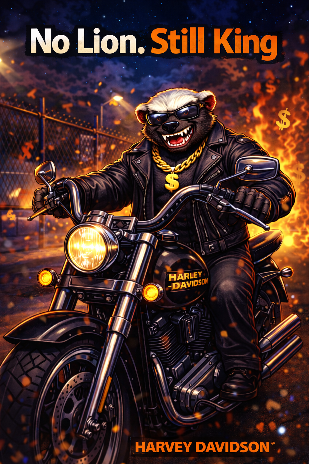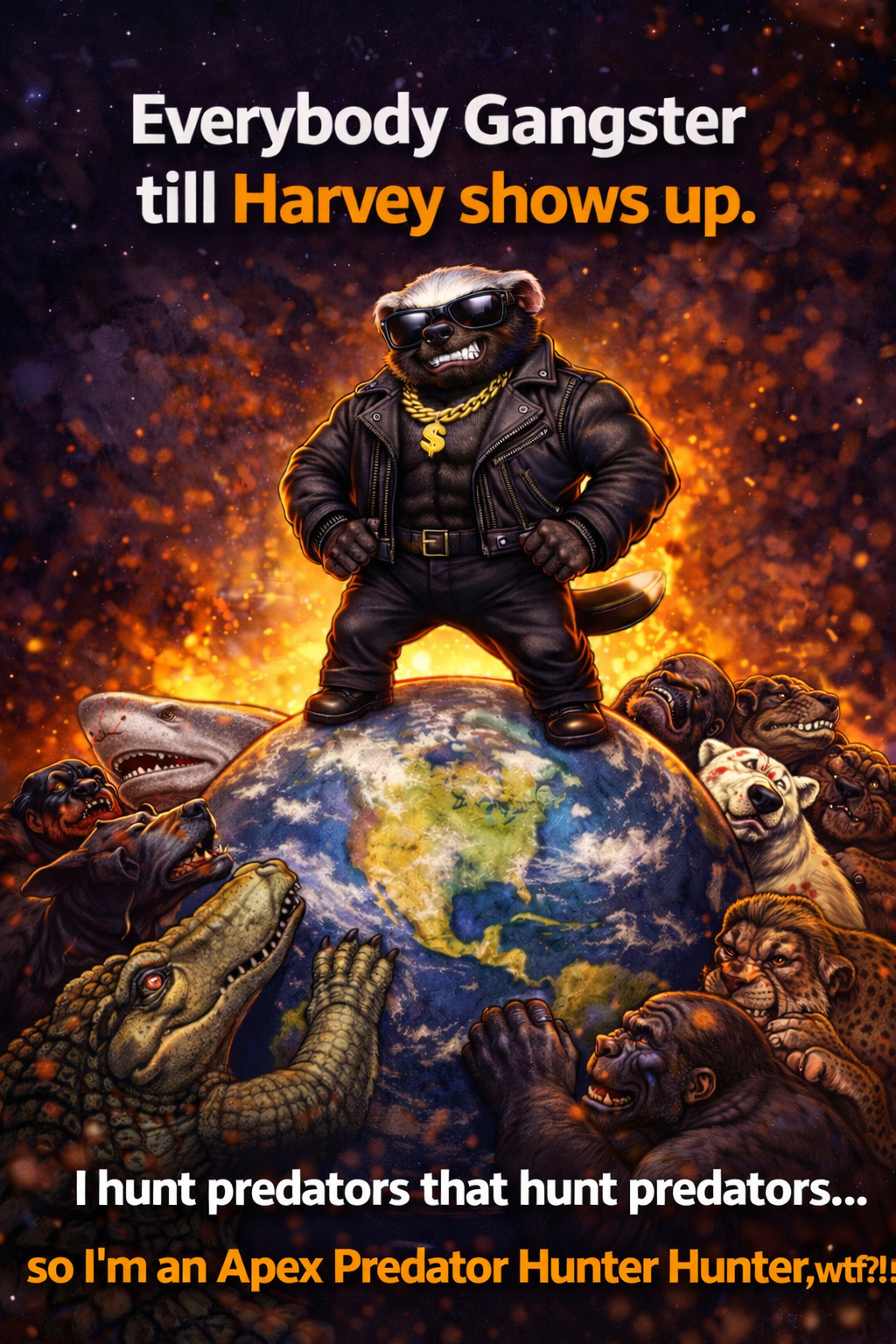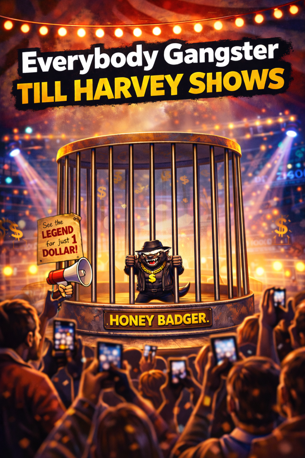 BADASS-MEME SONG, Bouncy badass-rap anthem over bright trap, Mantra-driven meme gangster phonk anthem built on hypnotic repetition and arrogant, no-fucks-given apex-predator energy, Minimal looping structure with short chant phrases, aggressive, and crowd-style gang vocals, Sound blends gangster rap, nu metal aggression, and violent phonk, with distorted 808s, gritty bass, hard phonk drums, minimal techno pulse, and outlaw rock / outlaw metal swing in the rhythm, Occasional metal-style stabs and drop-outs add impact, Vocals are dry, dominant, and front-center — confident, intimidating, meme-ready, Gang chants emphasize key phrases like “Harvey!”, “Everybody gangster till Harvey shows up”, delivered with US Army cadence influence, Energy rises steadily toward chaos — violent, fearless, and unstoppable — yet self-aware and exaggerated, celebrating survival, confidence, and life through humor and dominance, A gangster honey badger anthem — apex predator presence, zero fear, full badass