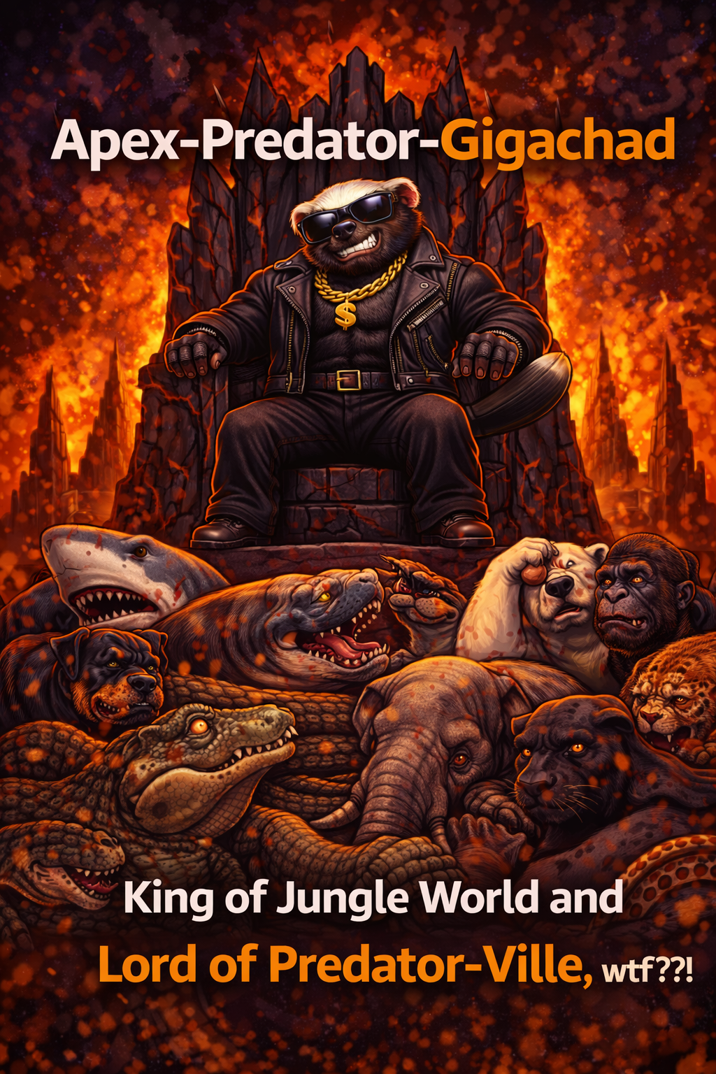 A lot of meme like growling, male power sounds, flexxing, Nu-Metal Cartoon Violence Energy, Meme Gangster Rap, Meme-driven gangster phonk with nu metal aggression and cartoon violence energy, Dark phonk bass, distorted 808s, crunchy guitars, and minimal techno pulse, Abrupt beat drops, slapstick-style sound effects, pitch-shifted ad-libs, exaggerated pauses for punchlines, The track balances real menace with ridiculous humor - like an apex predator in a cartoon world, Vocals are arrogant, playful, and fearless, designed for repetition and meme clips, with chant hooks and sudden comedic breaks, Make the sound / lyrics more aggressive, violent, intense over time, Intensity rises into a full violent, almost screamed, over confident, still meme like predator anthem