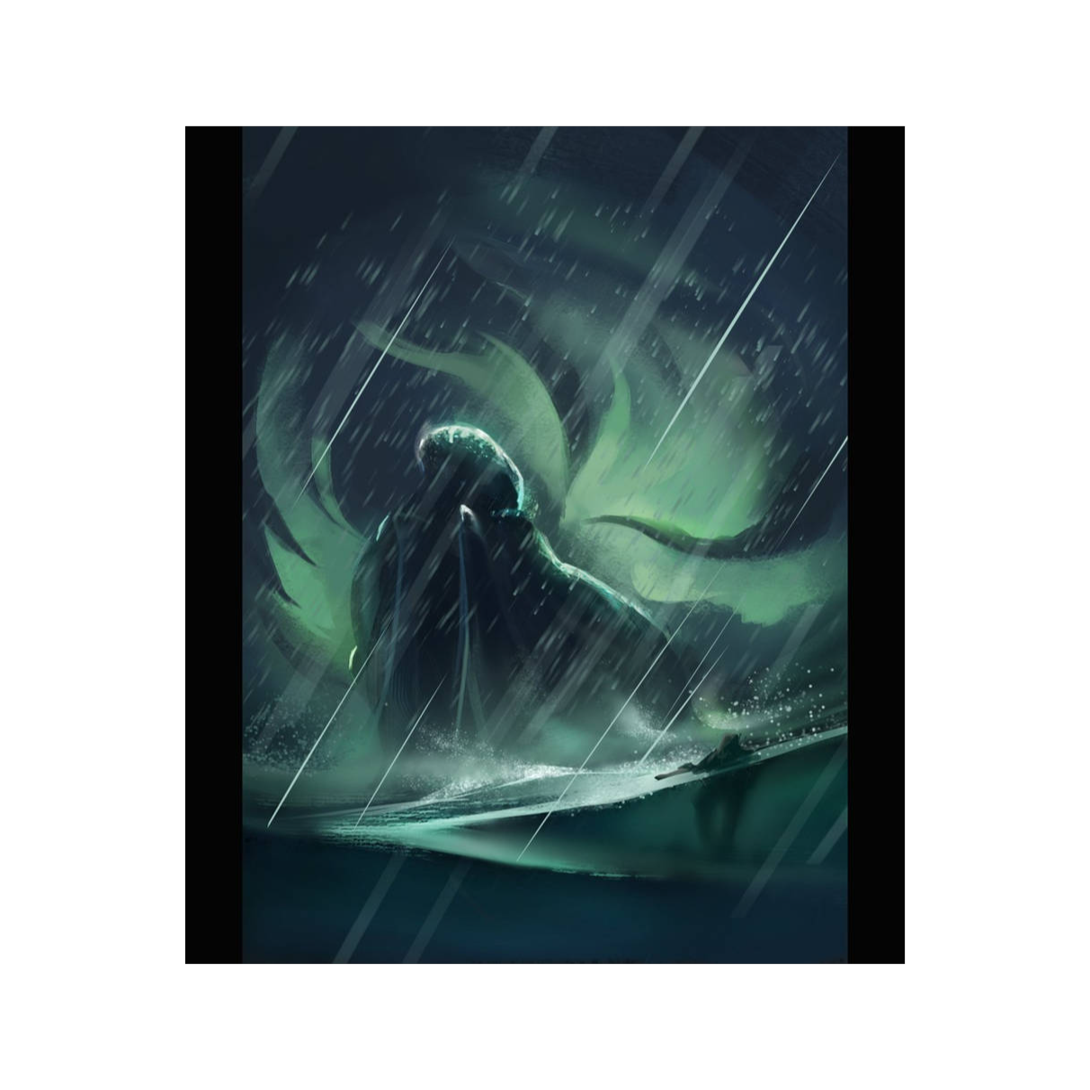 haunting lullaby, dark ambient, oceanic choral layers, 70 BPM, E minor, soft piano + cello + whispering reverb, mix of fear and affection, cosmic hymn to a misunderstood god