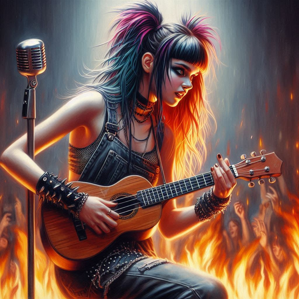 Acoustic surf punk, ukulele, broken raspy cracked female voice, throat fry, screaming, hardcore, fast, chaos, crusty, drunk, slurry