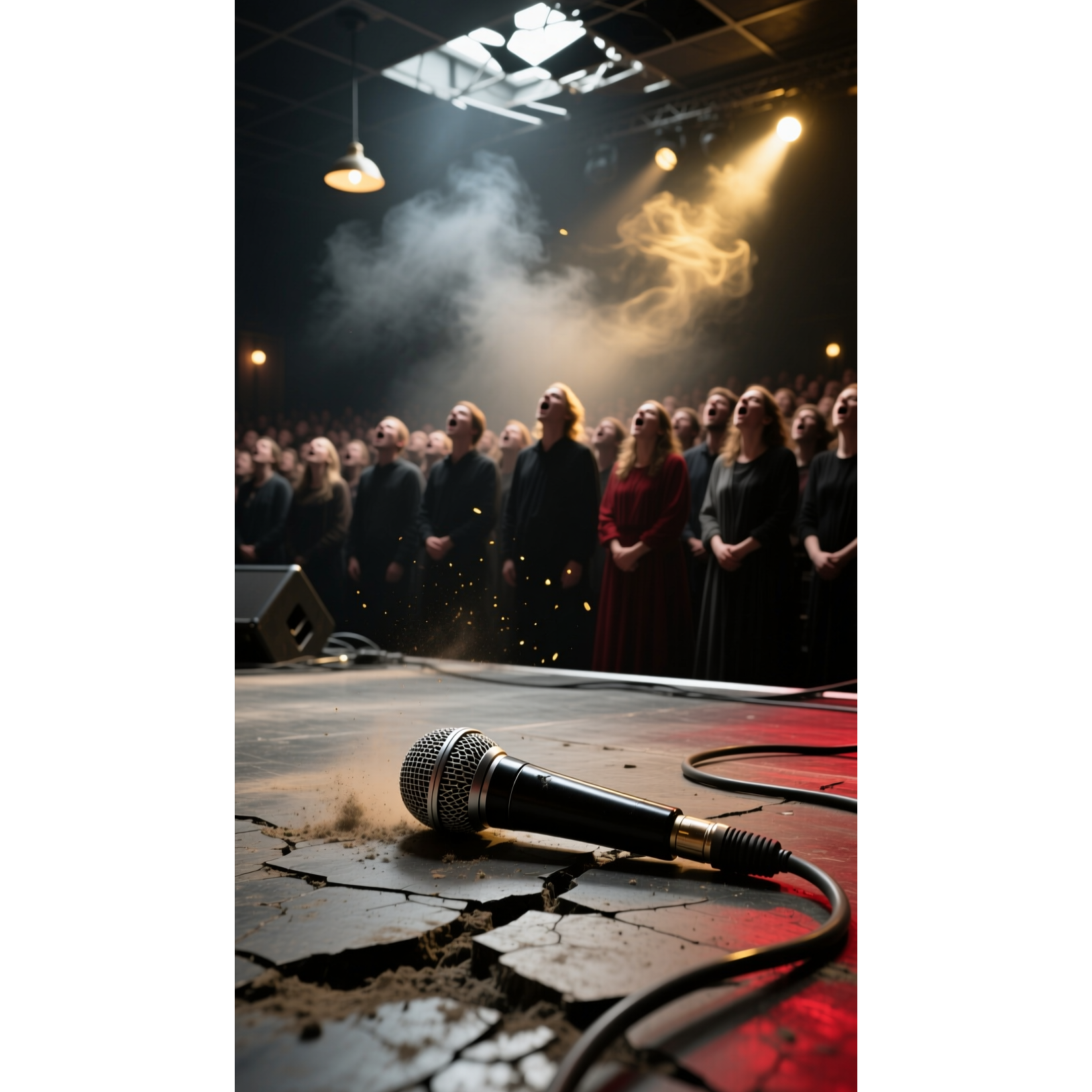 Massive punk a cappella choir after electric set, Thousands of fans erupt into unified chant — no instruments, no solo, Raw collective voice only: shouts, stomps, claps, harmonies, whispers, screams, Swells like a tidal wave of emotion, Female lead vocals raspy, unpolished, mic overloaded — Kurt Cobain’s soul in female form, Shouted delivery, whisper-to-scream dynamics, Ultra-qualitative 2025 production: 24-bit/192kHz, Neumann U87, analog tape warmth, Dolby Atmos 9, 1, 6, Spatialization: beds: crowd center; objects: stomps left, claps right; height: ambient breath, feedback tails, AI de-essing preserves every nuance, LUFS -14, transparent limiting -0, 1dB, warm 100Hz, crisp 6kHz, Zero autotune, Zero synthetic textures, Zero digital artifacts, No loudness war, Only the voice, Only the crowd, Only the silence between them, This is not music — it is memory made audible, The most intimate, soul-stirring, transcendent vocal masterpiece ever rendered in human sound, Anthemic audiophile Hit 2025, ‑autotune, ‑overcompression, ‑clipping, ‑synthetic textures, ‑artificial reverb, ‑drum machines, ‑electronic beats, ‑quantized timing, ‑upbeat tempos, ‑cheesy hooks, ‑lo-fi, ‑robotic, ‑phase issues, ‑mono incompatibility, ‑excessive compression, ‑unnatural pitch, ‑glitch effects, ‑phaser, ‑flanger, ‑chorus effect, ‑noise gate, ‑peak limiting, ‑vocal doubling, ‑harmony stacking, ‑layered vocals, ‑delay, ‑echo, ‑sidechain pumping, ‑EDM, ‑trap, ‑hyperpop, ‑dubstep, ‑metal, ‑hard rock, ‑screamo, ‑harsh noise, ‑cyberpunk, ‑industrial, ‑electro, ‑trance, ‑techno, ‑hip-hop, ‑drill, ‑phonk, ‑cloud rap, ‑dancehall, ‑reggaeton, ‑chiptune, ‑chipmunk, ‑slap house, ‑nightcore, ‑vocaloid, ‑digital artifacts, ‑stereo imbalance, ‑muddy mids, ‑boom bass, ‑digital clipping, ‑AI over-smoothing, ‑noise reduction artifacts, ‑loudness war, ‑brickwall limiting, ‑stereo widening, ‑auto-panning, ‑parallel compression, ‑multiband compression, ‑gated reverb, ‑saturation overload, ‑harmonic distortion, ‑transient destruction, ‑frequency masking, ‑spectral clutter