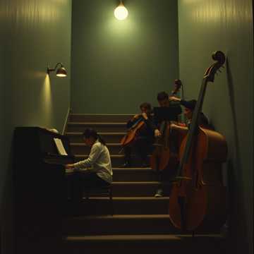 jazz, Modern jazz instrumental, 68–74 BPM, solo-to-quartet flow, Start with sparse, slightly detuned piano voicings, jagged left-hand stabs, right-hand clusters that open into unexpected tensions, Brushes on snare and dry ride cymbal sketch broken swing; bass walks in loose, conversational phrases, Drop in occasional alto sax and muted trumpet hits for angular unison lines, then let them peel off into brief, crooked counter-melodies, Leave generous space for silence and sustain, letting dissonances hang before resolving sideways, Overall arc: quietly contemplative intro, mischievous middle section with rhythmic feints, then a wry, soft-landing coda that ends on a delightfully puzzling chord, playful