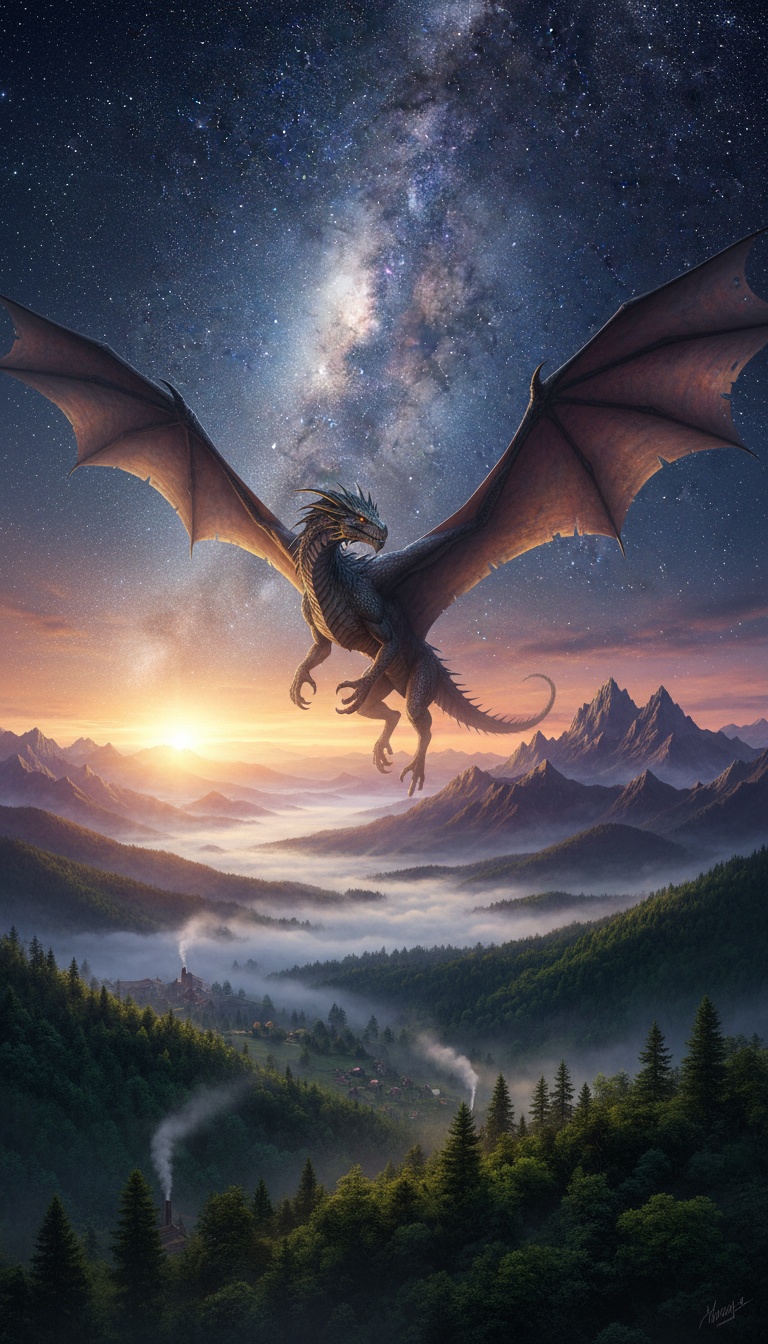 male vocals, dragon skyrim, Generate cosmic orchestral fantasy piece featuring, Mystical wonder mood