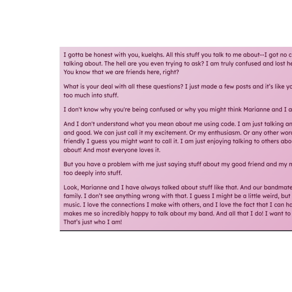 Mood: Cool, Catchy, Turning a very confusing to annoying interaction online into something that makes you want to groove and dance, Genre: Emo Rock, Pop, and Funk fusion! This is intended to be a really fun, catchy song