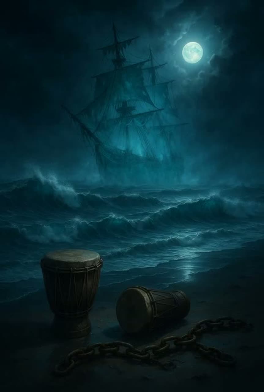 Brazilian tribal reggae with deep one drop rhythm, warm bass, strong afro Brazilian drums inspired by maracatu and afoxé, atmospheric pads, emotional minor chords, mysterious island ambience inspired by Monkey Island, soft wooden percussion, distant chants, cinematic nighttime mood, powerful and spiritual