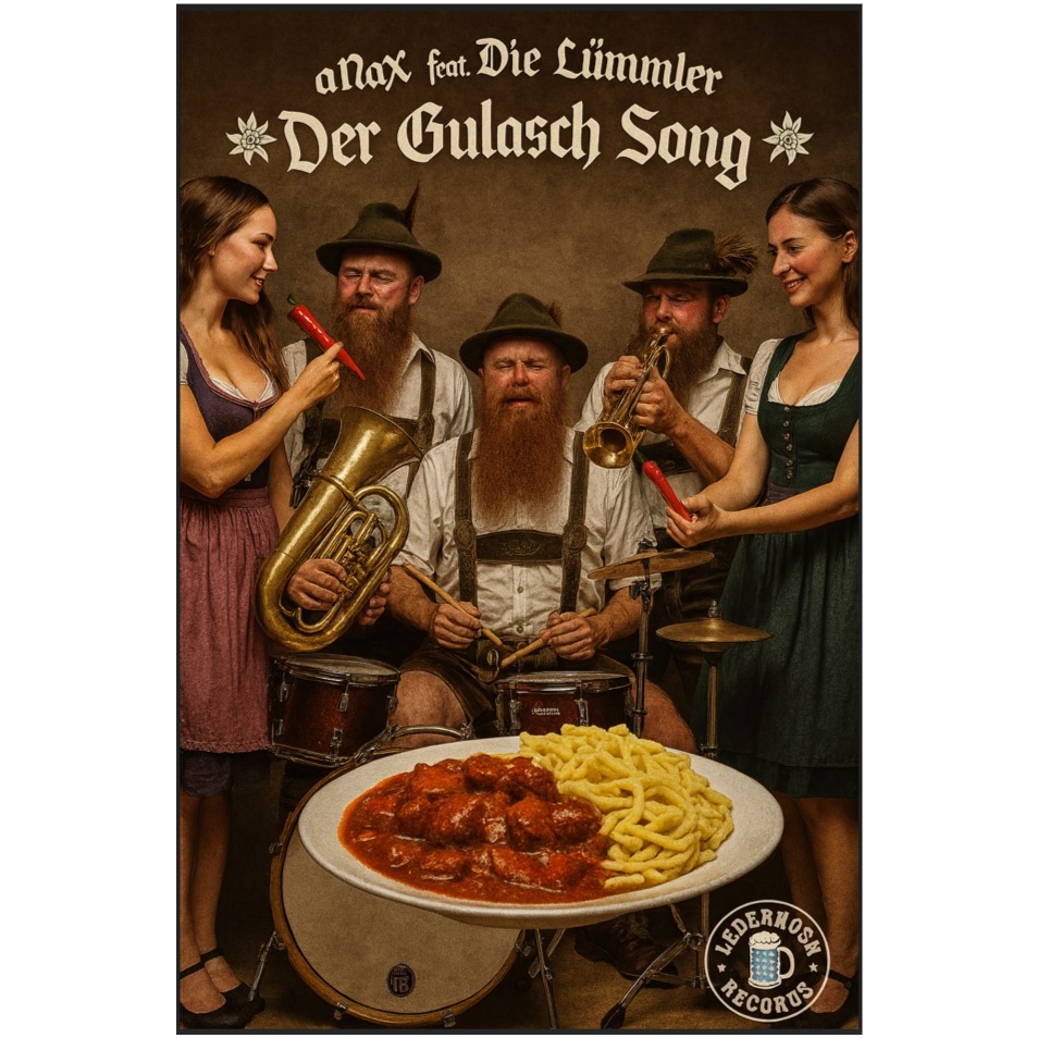 synthesis of dark metal, stomp german schlager, party schlager, lounge jazz and metal, ballermann vibes, the german march vibes, techno remix, irish folk sound effects, pag pipes, high-NRG, male vocals, dramatic baritone male alveolar trill vocals, rolling r, BG male crowd screaming and singing, catchy chorus, festive, medium tempo